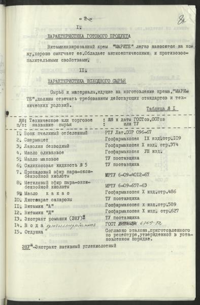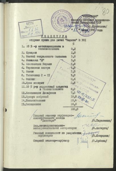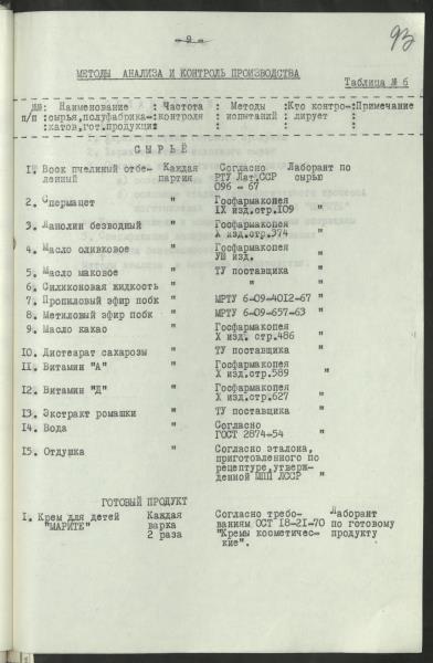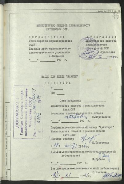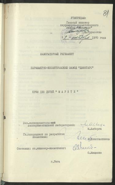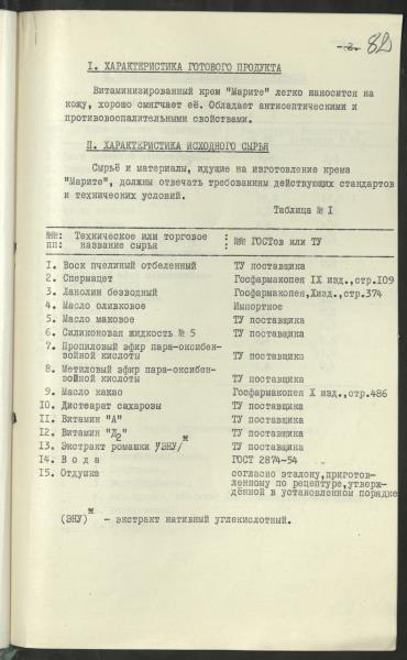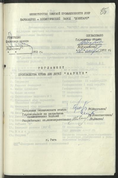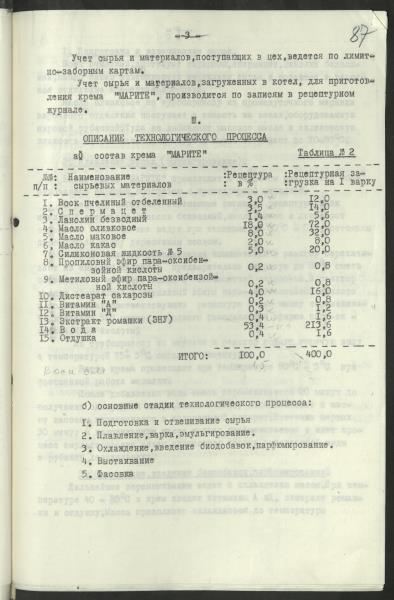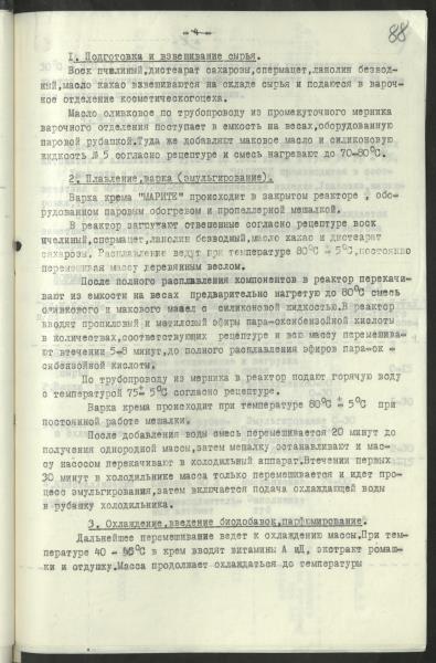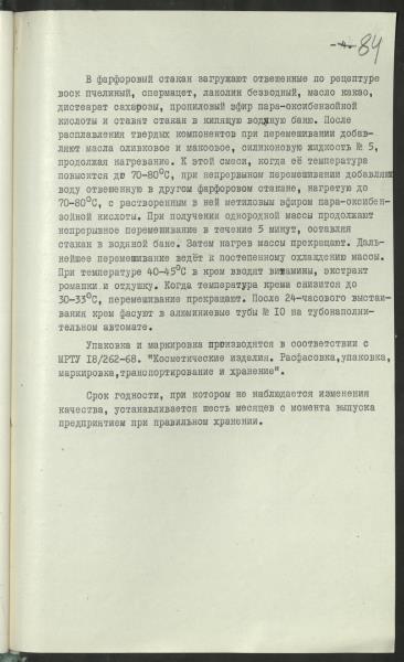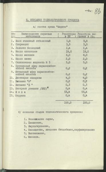 Fonds: Rīgas parfimērijas - kosmētikas rūpnīca "Dzintars", Rīgas parfimērijas - kosmētikas rūpniecības ražošanas apvienība "Dzintars" un akciju sabiedrība "Dzintars". Lieta: Kosmētikas krēmu izgatavošanas tehniskie uzdevumi un receptes.