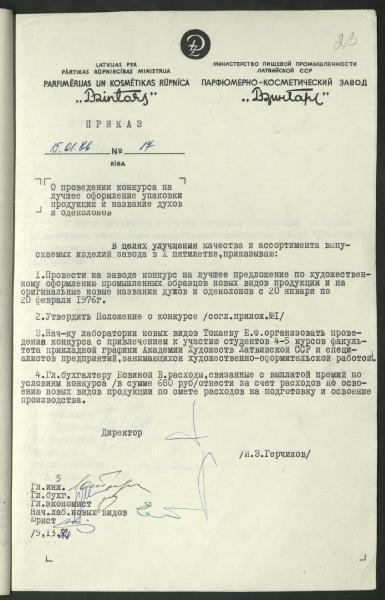 Fonds: Rīgas parfimērijas - kosmētikas rūpnīca "Dzintars", Rīgas parfimērijas - kosmētikas rūpniecības ražošanas apvienība "Dzintars" un akciju sabiedrība "Dzintars". Lieta: Direktora pavēles ražošanas jautājumos Nr.1.-47.