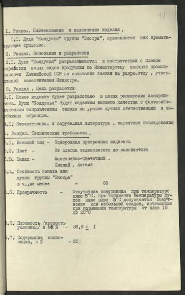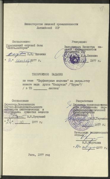 Fonds: Rīgas parfimērijas - kosmētikas rūpnīca "Dzintars", Rīgas parfimērijas - kosmētikas rūpniecības ražošanas apvienība "Dzintars" un akciju sabiedrība "Dzintars". Lieta: Tehniskie uzdevumi jauna veida produkcijai.