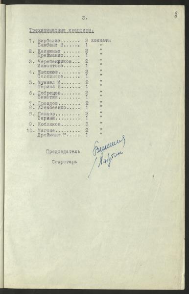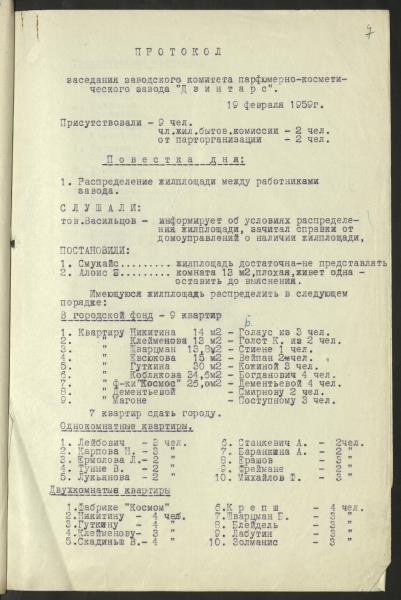 Protokols par piešķirtās dzīvojamās platības sadali rūpnīcā strādājošajiem.