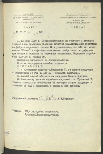 Pavēle Nr.382 par saldējuma "Pols" vafeļu glāzītē brāķa pārstrādi.