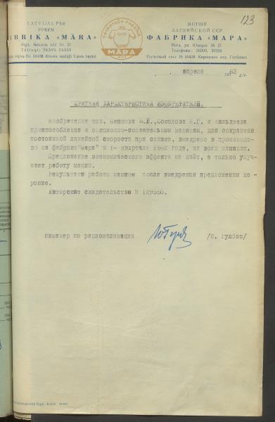 Fonds: Māra, valsts uzņēmums. Lieta: Atskaites par ieviestajiem racionalizācijas priekšlikumiem.
