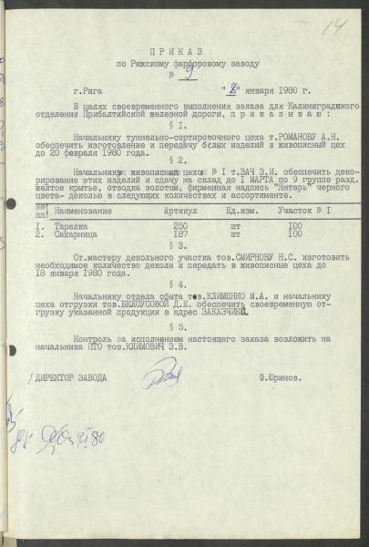 Fonds: Rīgas porcelāns, akciju sabiedrība. Lieta: Direktora pavēles par 1980.gada 1.ceturksni.
