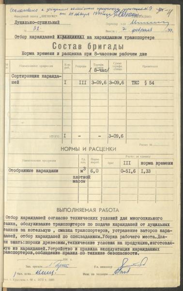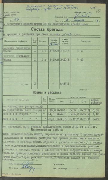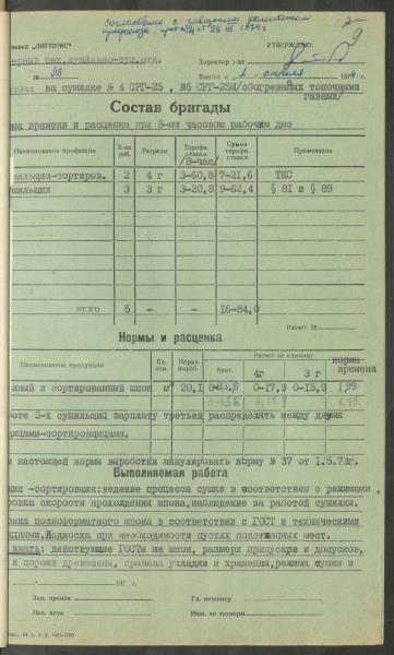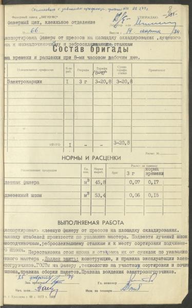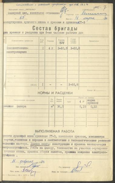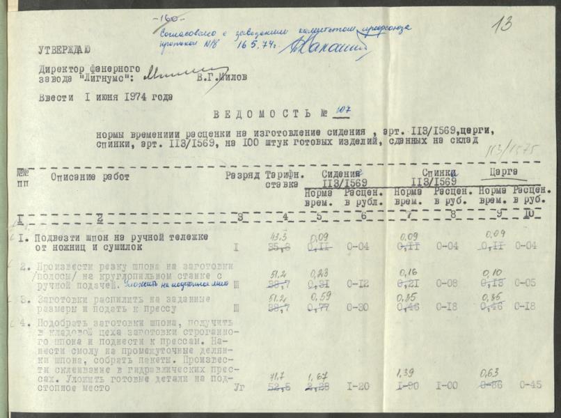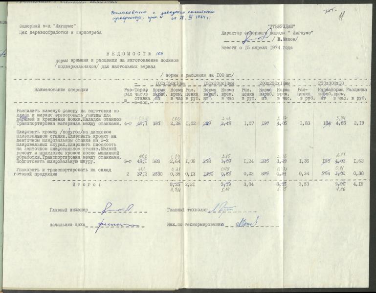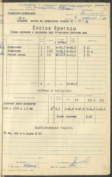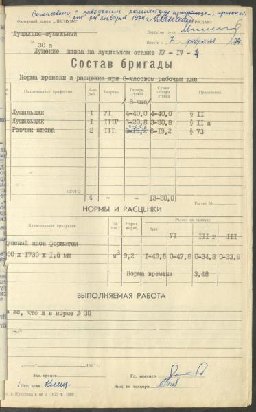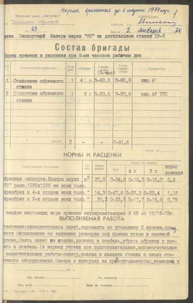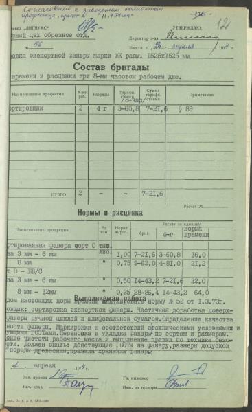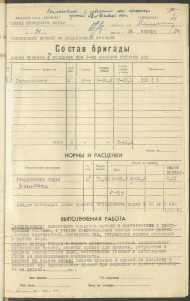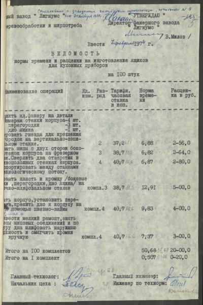 Fonds: Finiera rūpnīca "Lignums". Latvijas PSR. Lieta: Rūpnīcā izstrādātās laika un ražošanas normas.