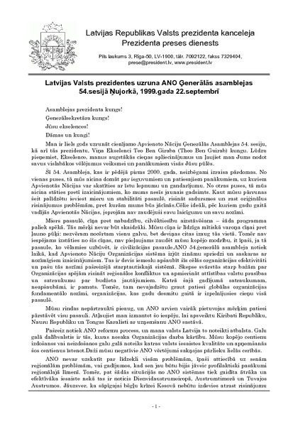 Latvijas Valsts prezidentes uzruna ANO Ģenerālās asamblejas 54.sesijā Ņujorkā, 1999.gada 22.septembrī