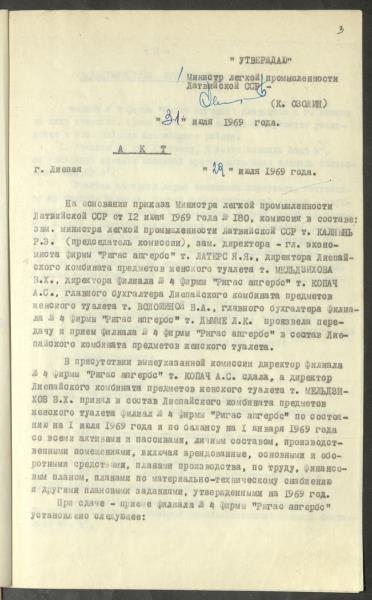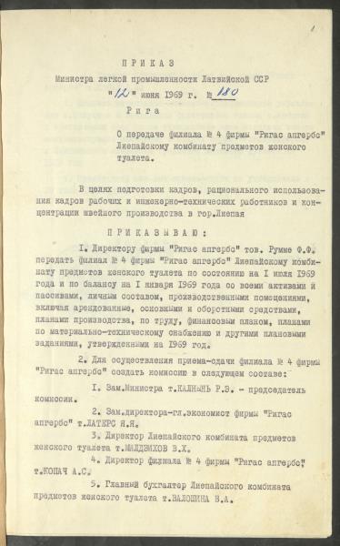 Dokumenti par "Rīgas apģērbs" filiāles Nr.4 nodošanu Liepājas kombinātam.