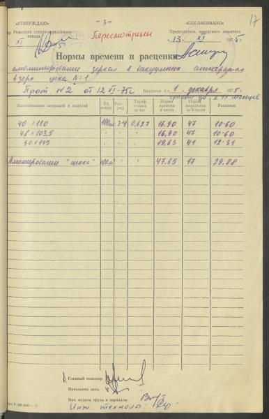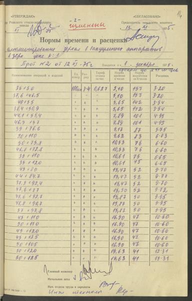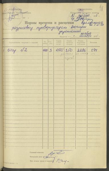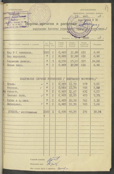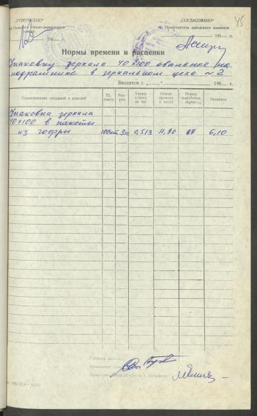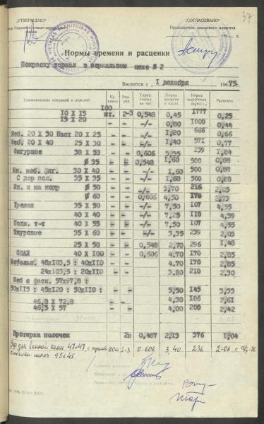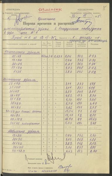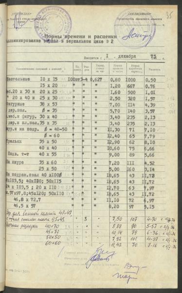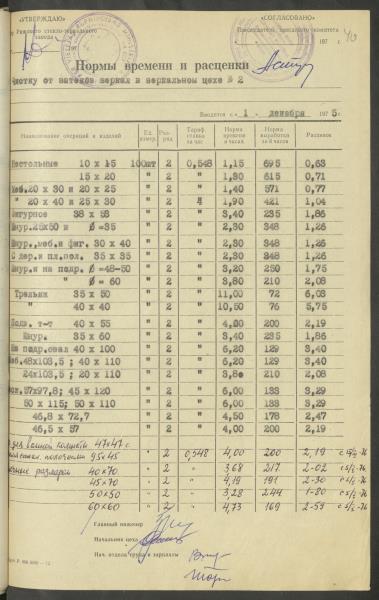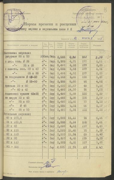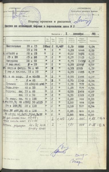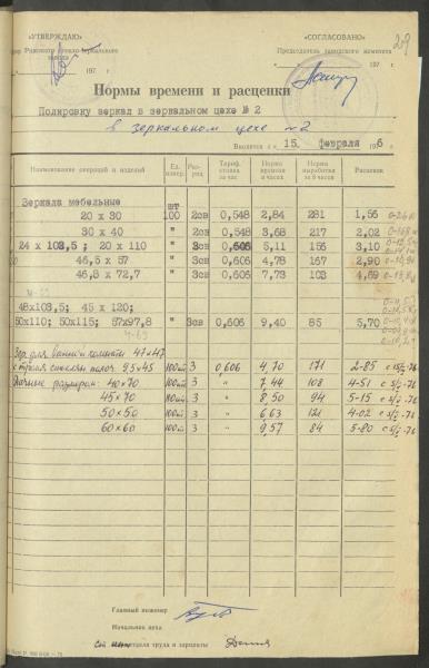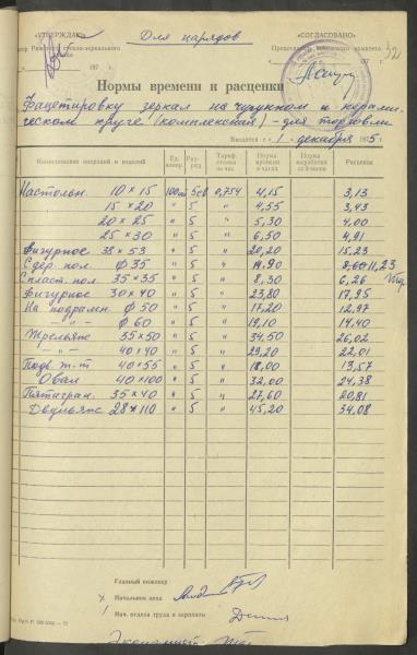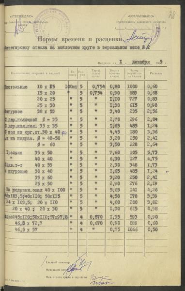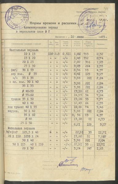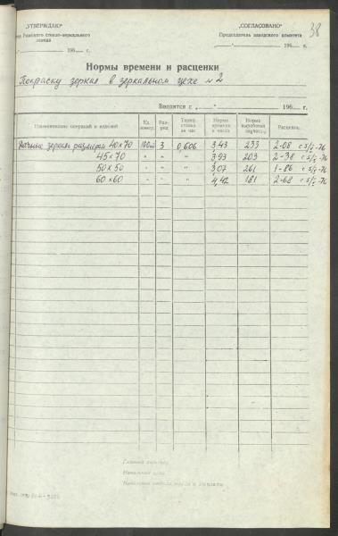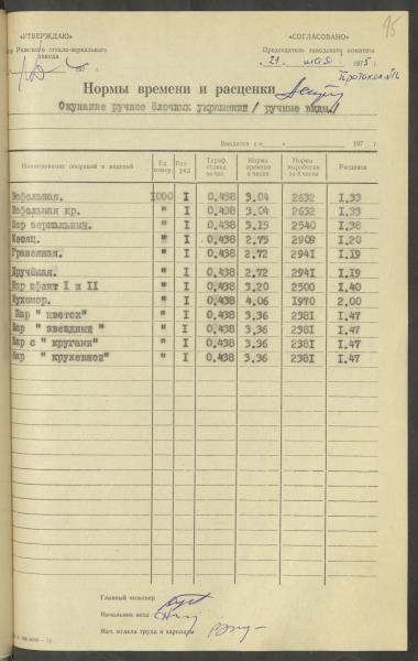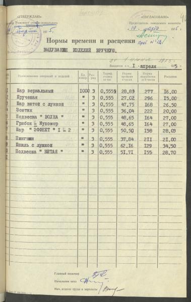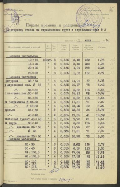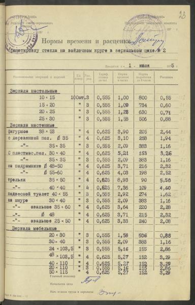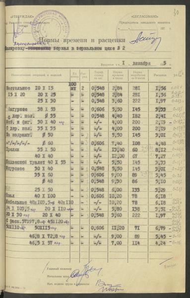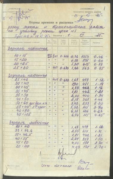 Fonds: Latvijas PSR Rūpniecības ministrijas Rīgas stikla un spoguļu rūpnīca. Lieta: Apstiprinātās ražošanas laika normas un produkcijas izcenojumi.