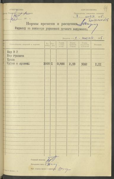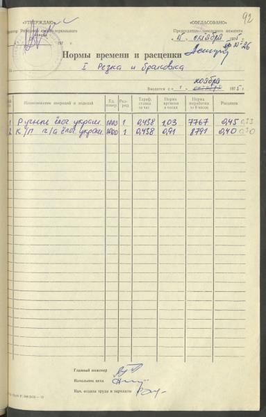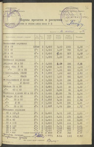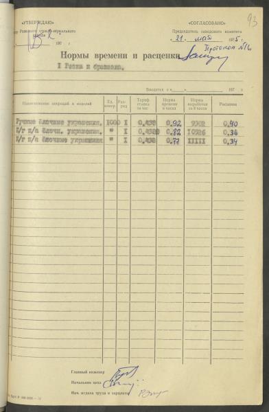 Apstiprinātās ražošanas laika normas un produkcijas izcenojumi.