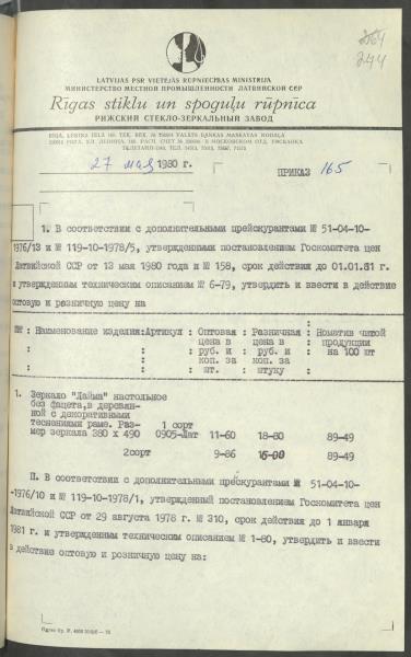Fonds: Latvijas PSR Rūpniecības ministrijas Rīgas stikla un spoguļu rūpnīca. Lieta: Direktora pavēles ražošanas jautājumos Nr.1.-Nr.174.