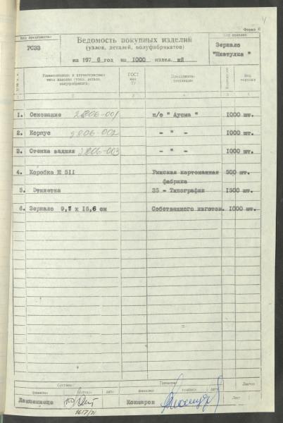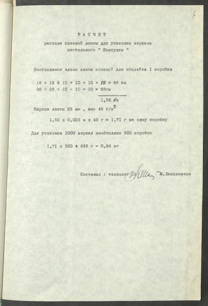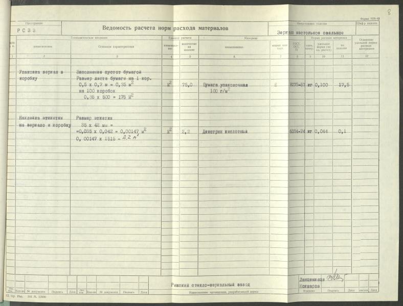Fonds: Latvijas PSR Rūpniecības ministrijas Rīgas stikla un spoguļu rūpnīca. Lieta: Galda spoguļa "Lādīte" izgatavošanas materiālu izlietojuma normas.