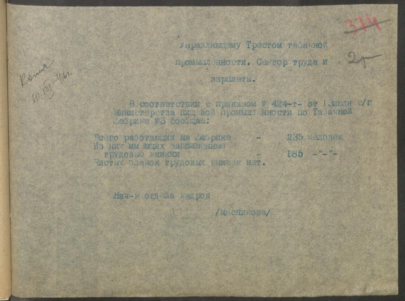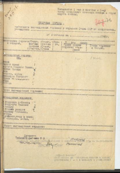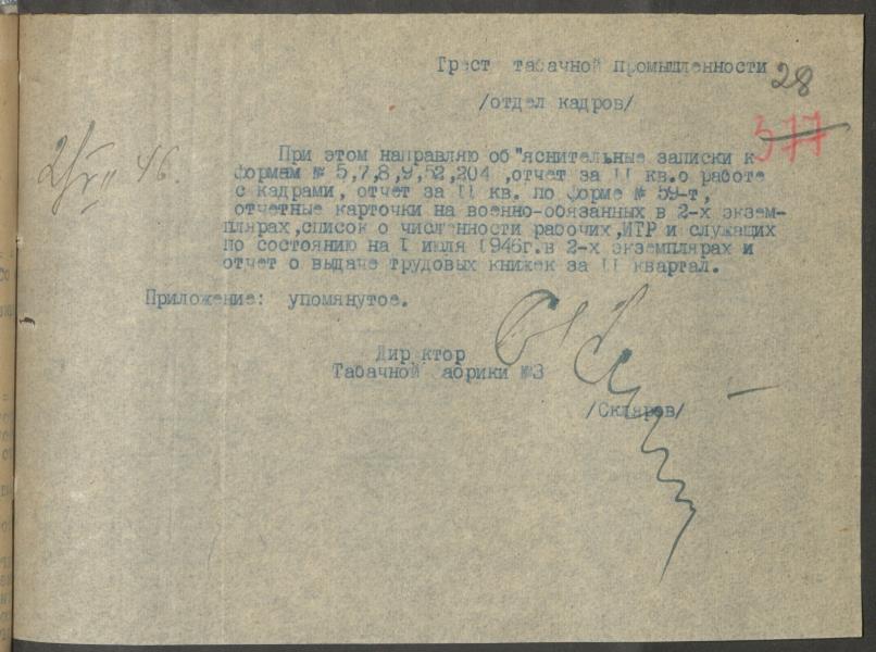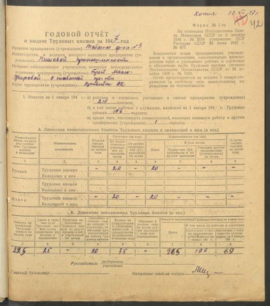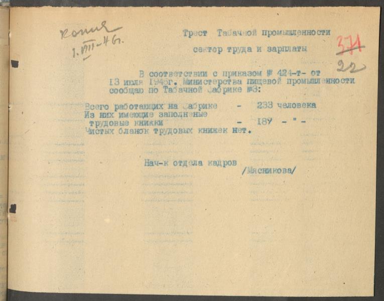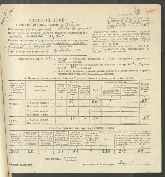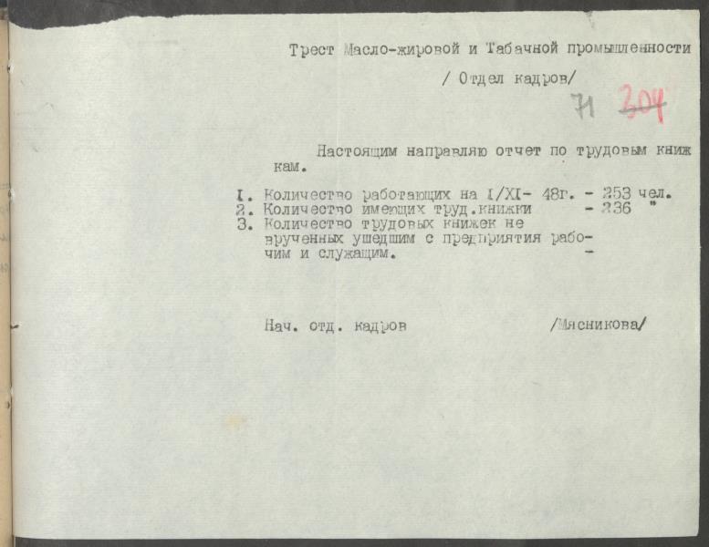 Fonds: Rīgas tabakas fabrikas. Lieta: Rīgas tabakas fabrikas kadru daļas atskaites par kadriem 1945.-1948.g.