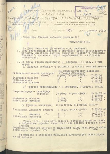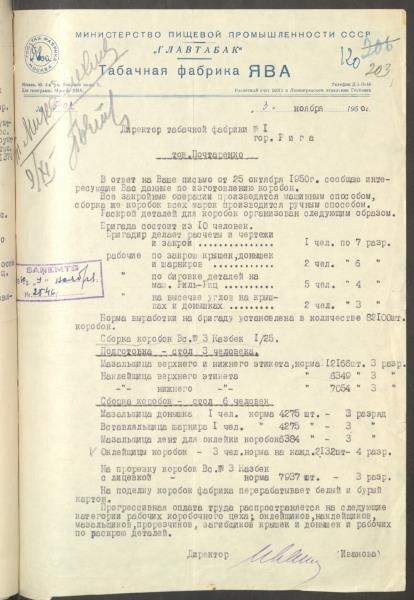 Tabakas fabrikas Nr.1 direktora sarakste par produkcijas izgatavošanu un piegādēm.
