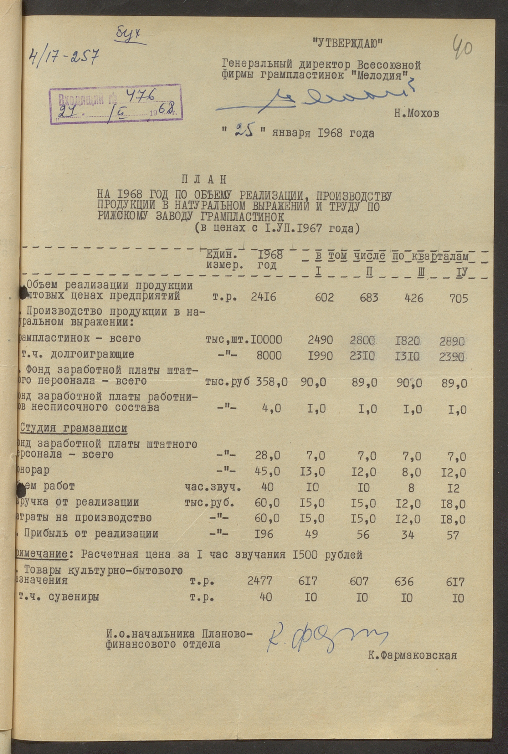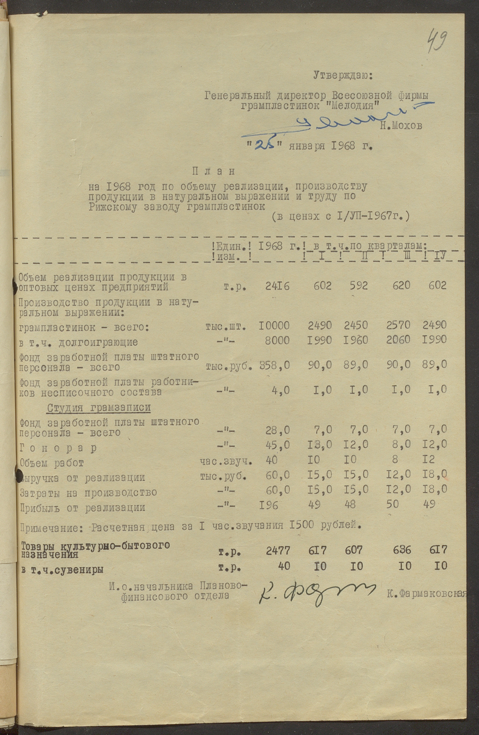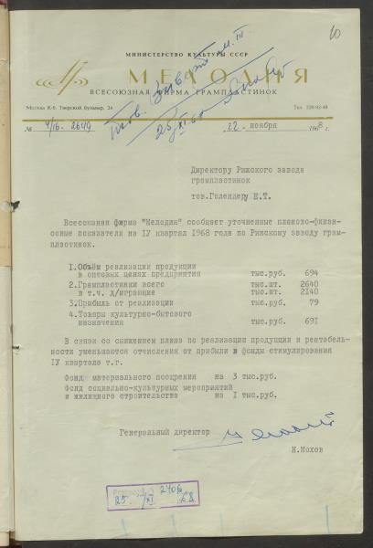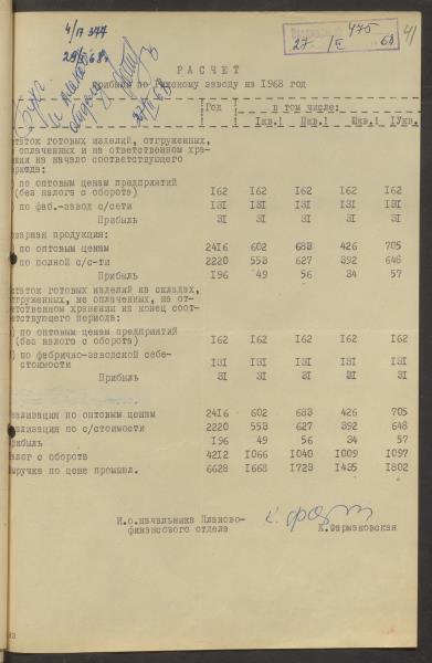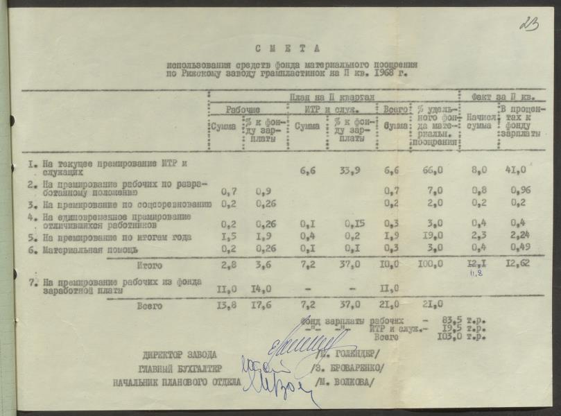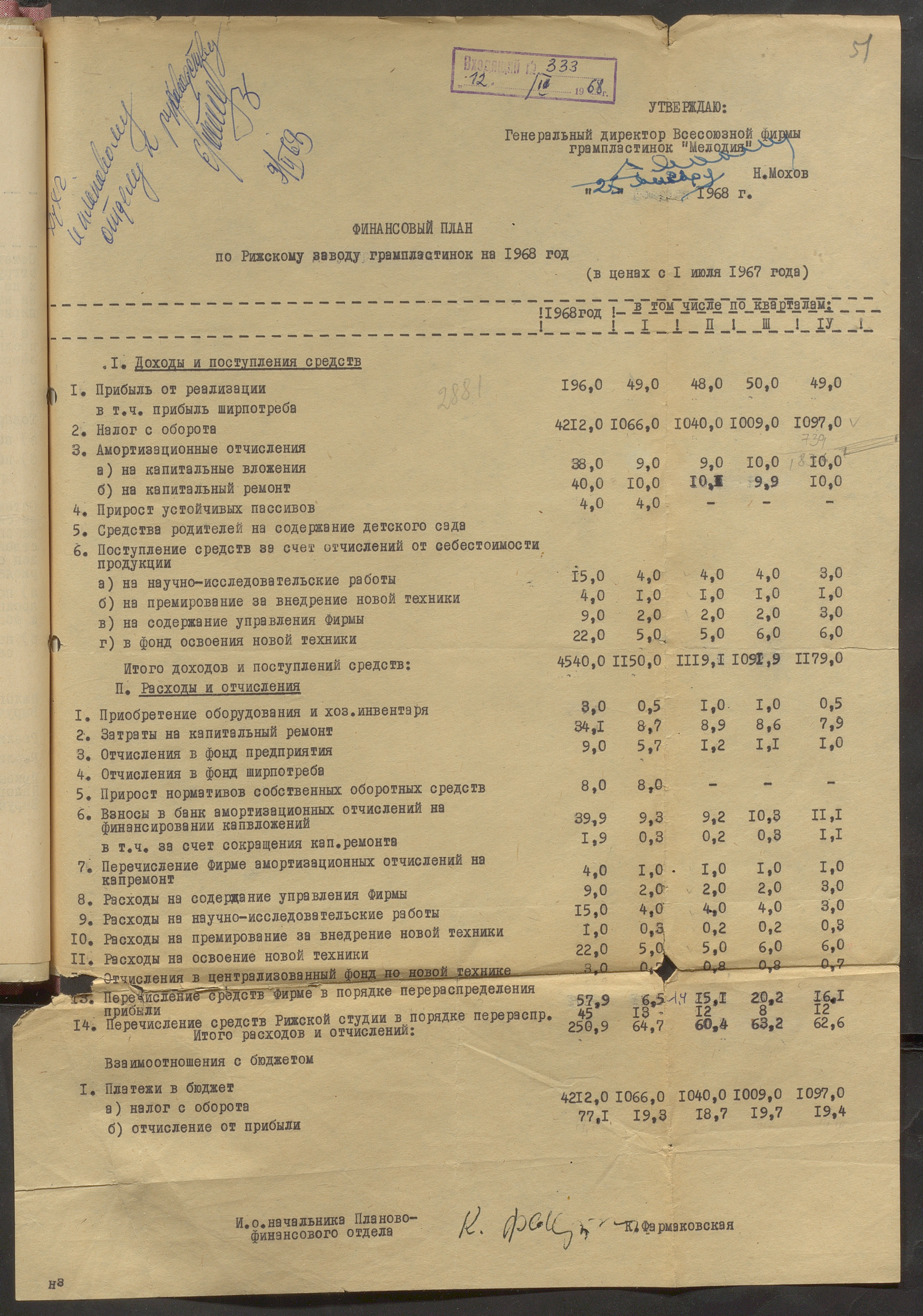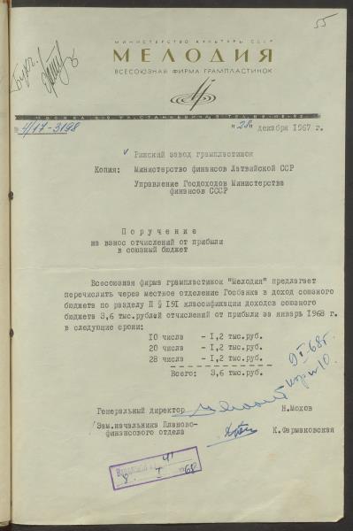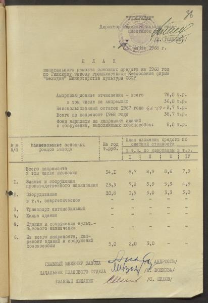 Fonds: Rīgas skaņu plašu fabrika "Melodija" un Ražošanas firma "RiTonis". Lieta: Fabrikas finanšu plāns 1968.gadam.