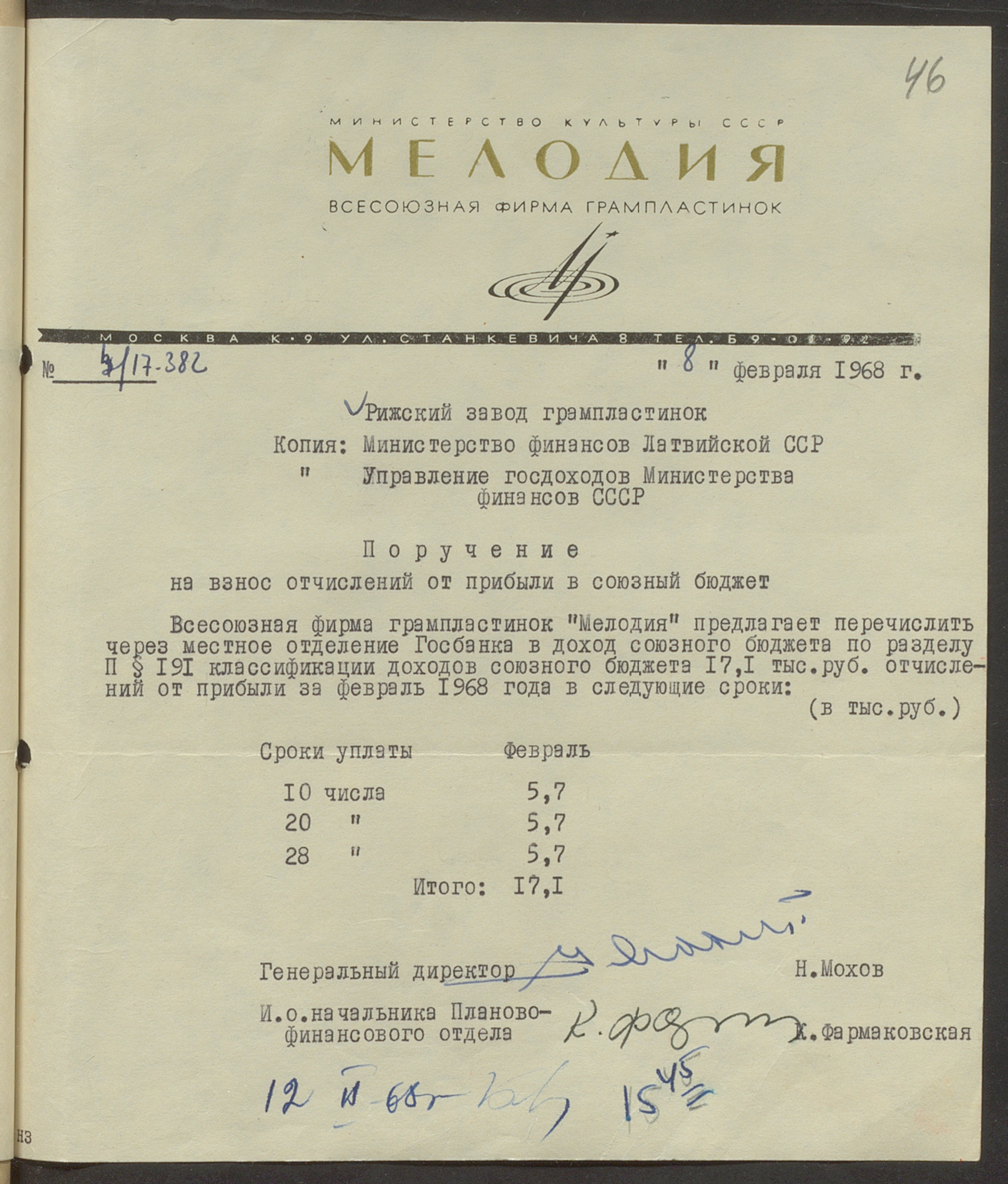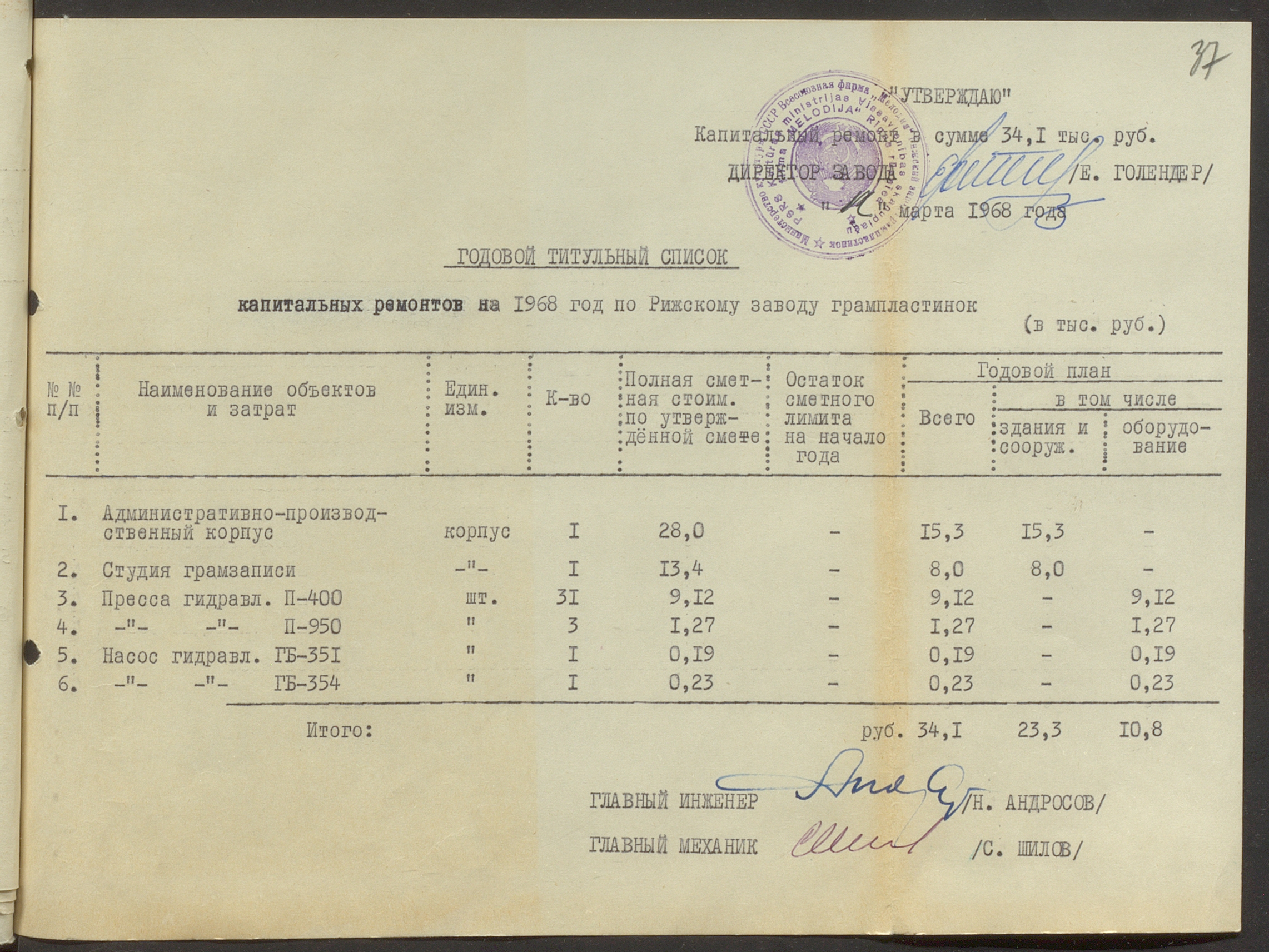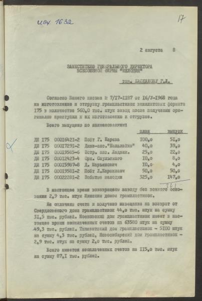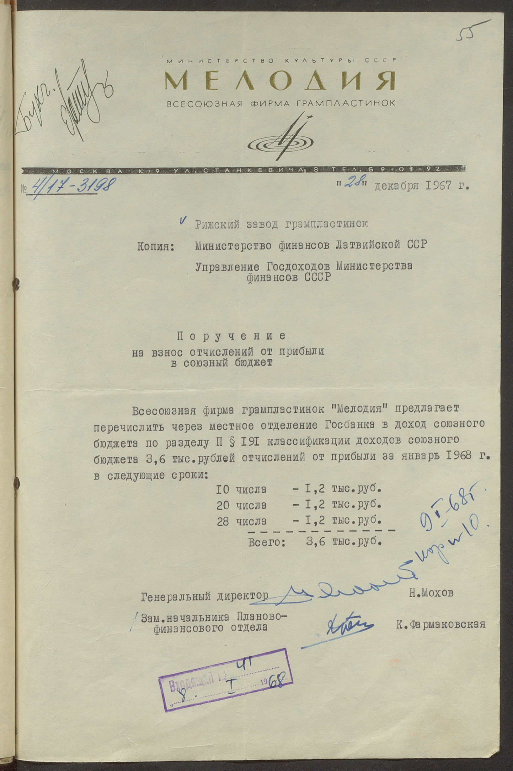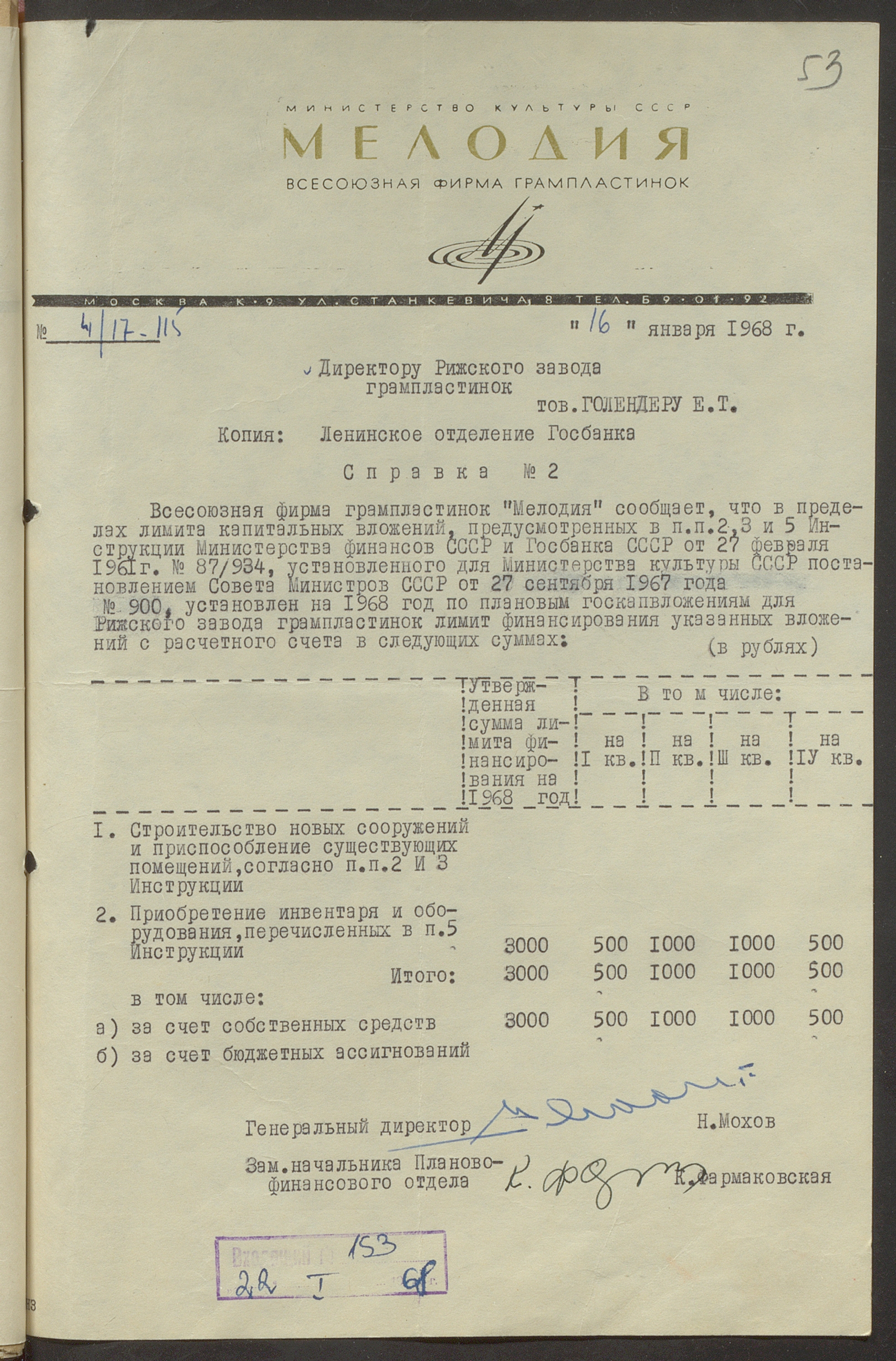Fonds: Rīgas skaņu plašu fabrika "Melodija" un Ražošanas firma "RiTonis". Lieta: Fabrikas finanšu plāns 1968.gadam.