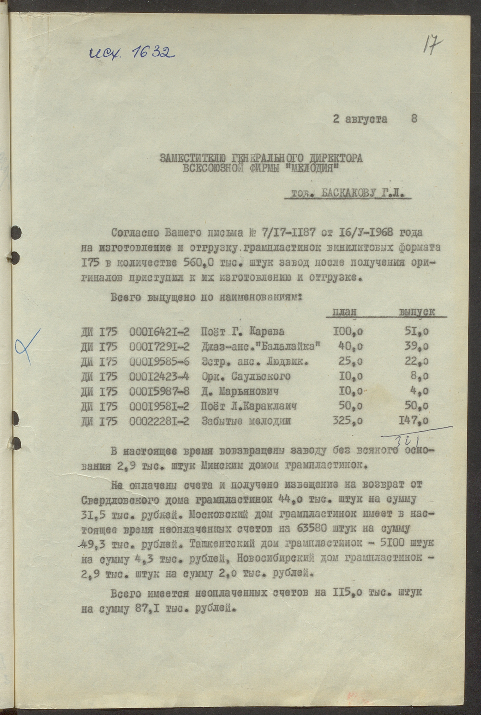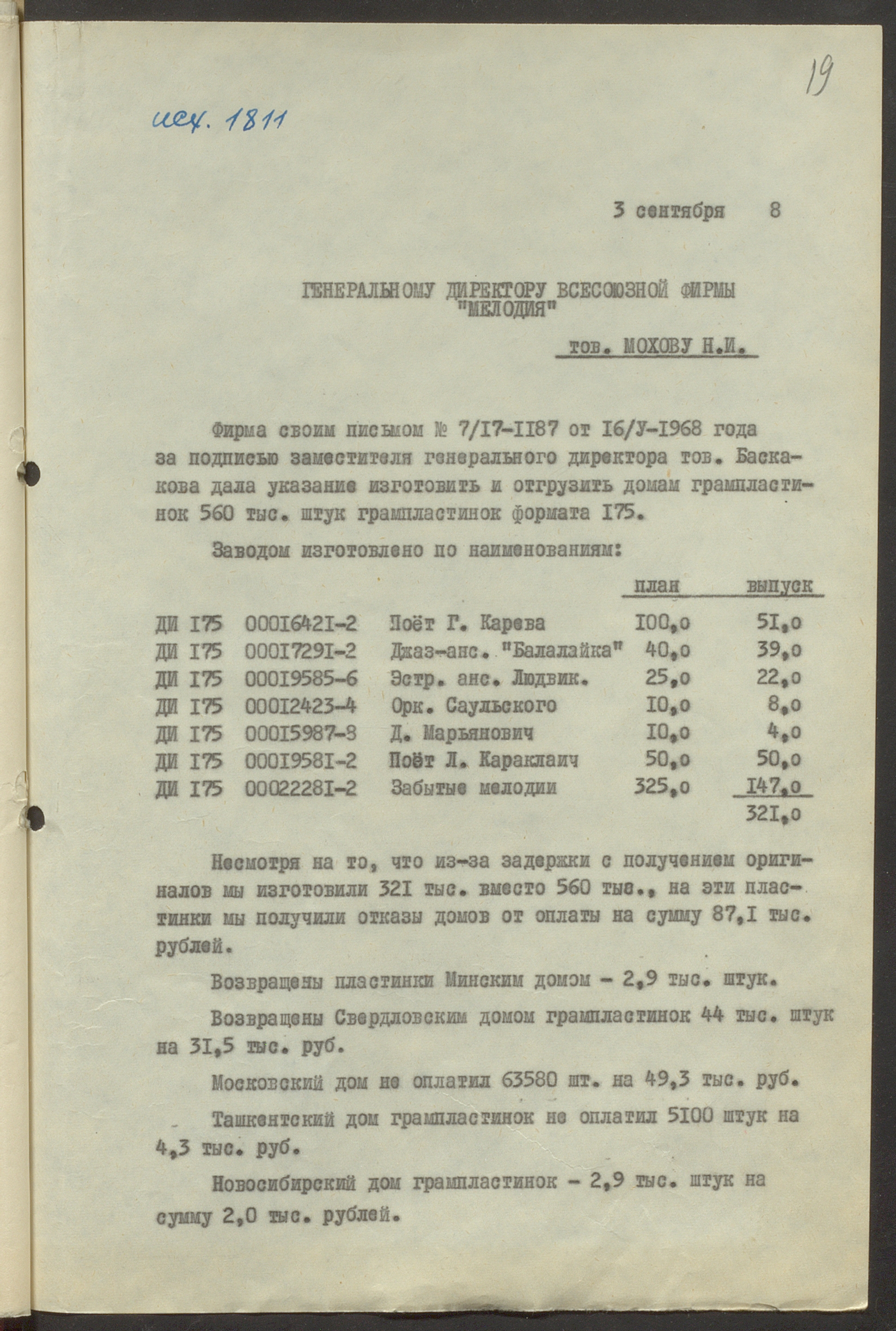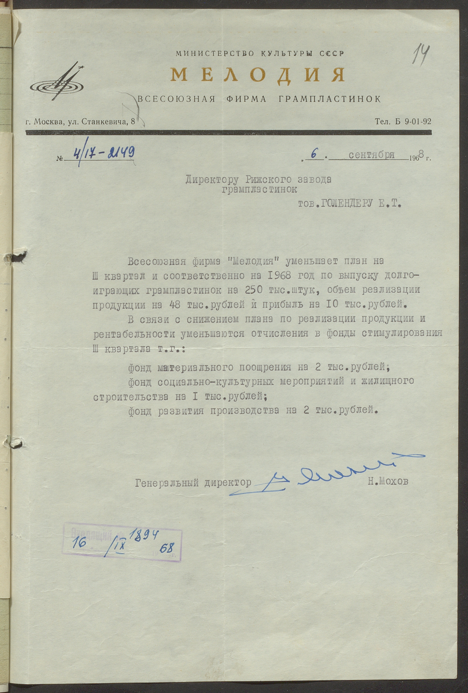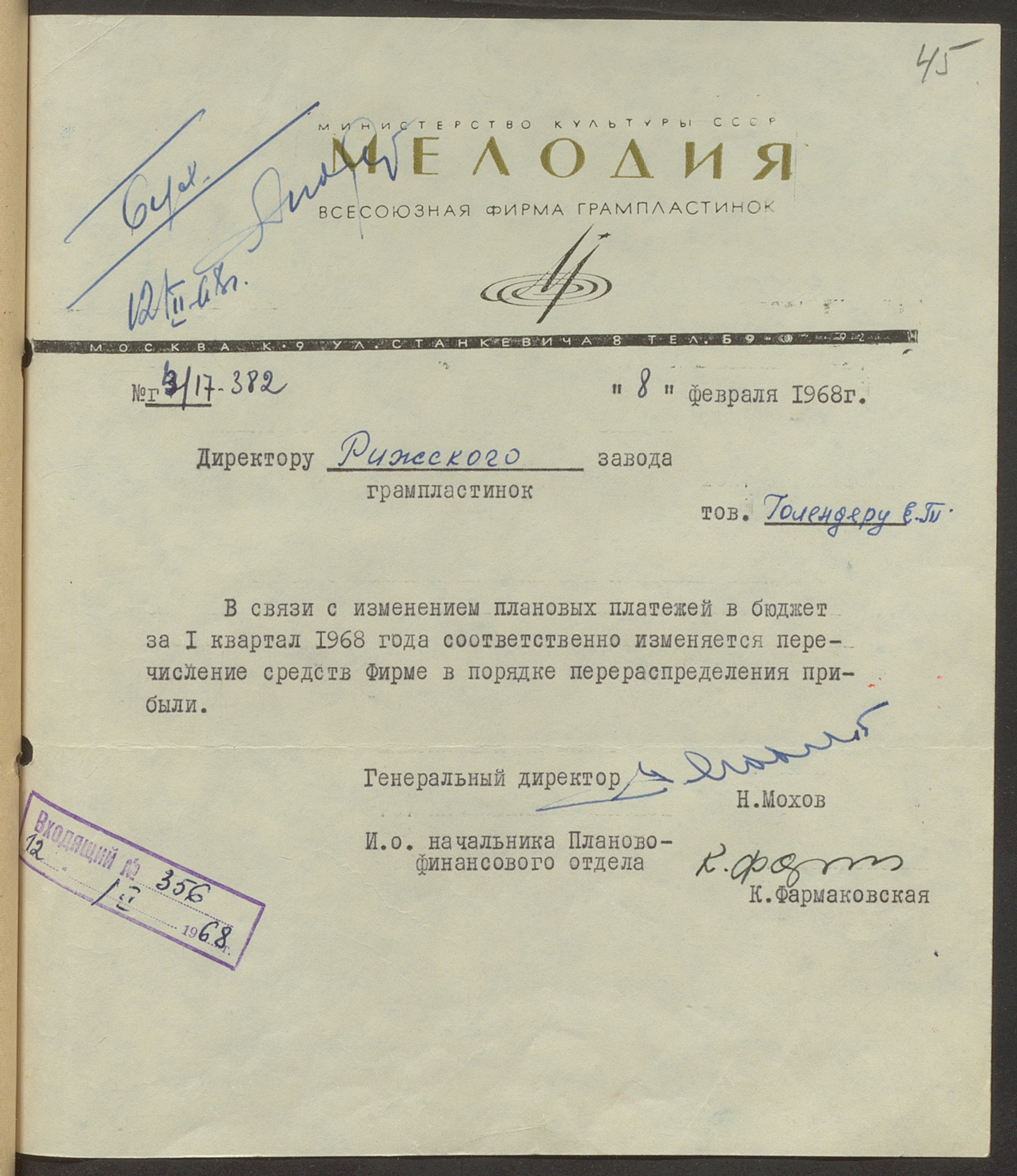 Fonds: Rīgas skaņu plašu fabrika "Melodija" un Ražošanas firma "RiTonis". Lieta: Fabrikas finanšu plāns 1968.gadam.