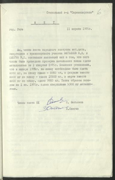 Fonds: Rīgas valsts stikla rūpnīca "Sarkandaugava", valsts uzņēmums. Lieta: Tautas kontroles grupas pārbaudes akti.