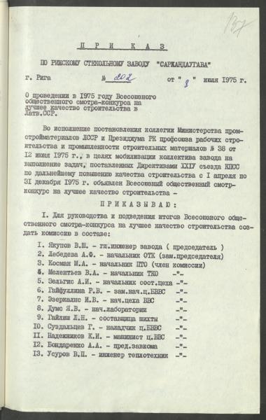 Fonds: Rīgas valsts stikla rūpnīca "Sarkandaugava", valsts uzņēmums. Lieta: Direktora pavēles un rīkojumi pamatdarbības jautājumos Nr.131.-255.