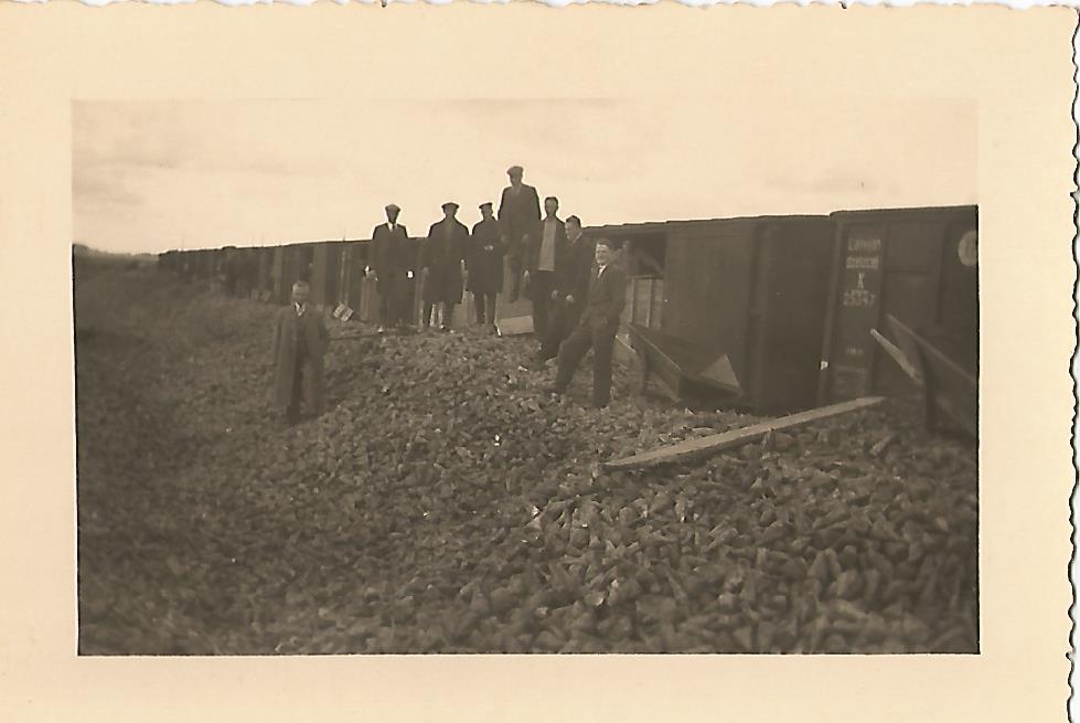 Biešu izkraušana no vagoniem blāķos. Krustpils cukurfabrikas 1937. gada kampaņā. Kreisajā pusē K.Kalniņš.