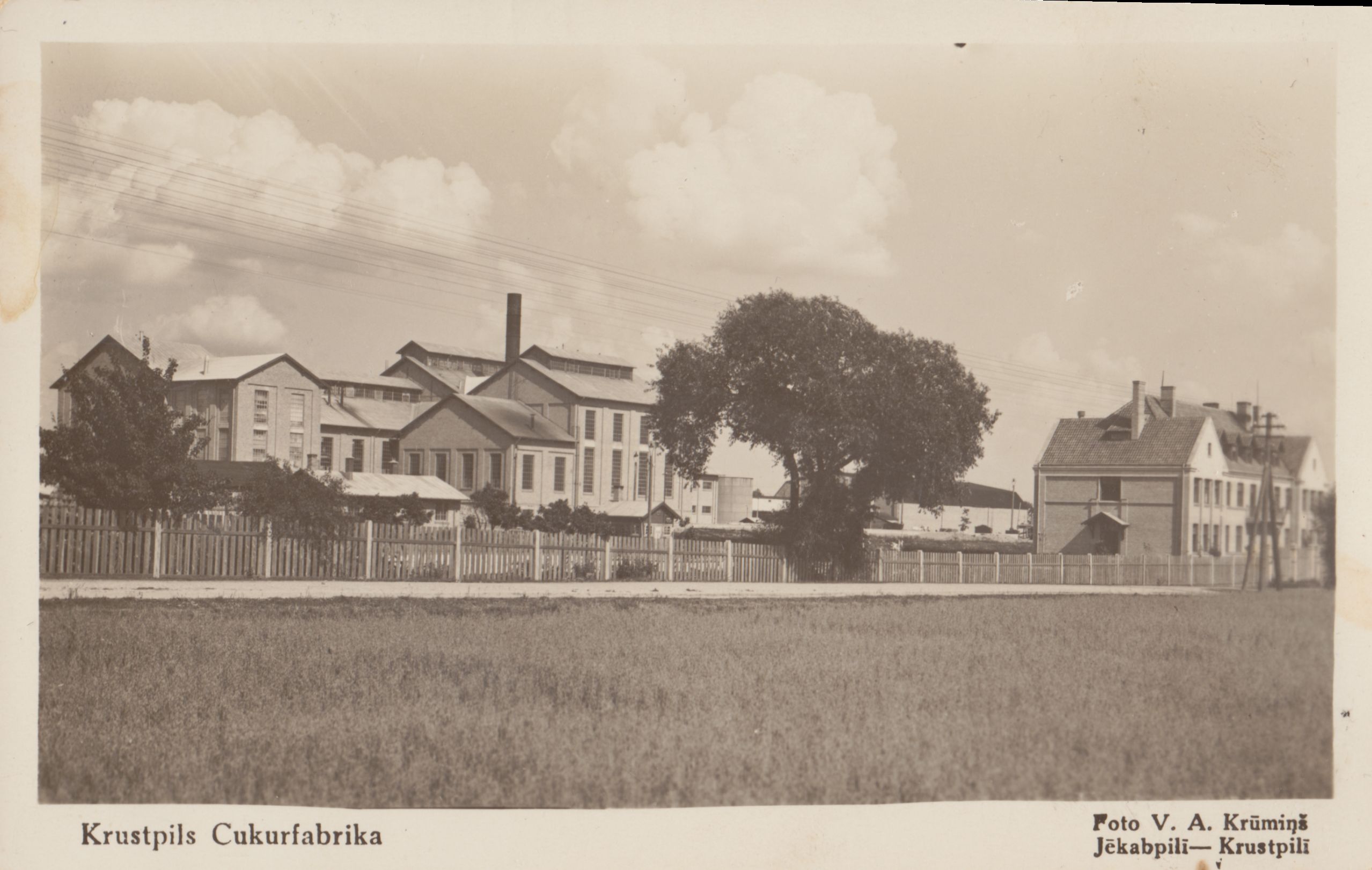 Iežogota Krustpils cukurfabrikas teritorija, kantora ēka atrodas labajā pusē. Krustpils cukurfabrika, vēlāk, apvienojot pilsētas, to sauca par Jēkabpils cukurfabriku, bija viena no trijām cukura ražotnēm Latvijā. Tā atradās Krustpils pilsētā), ceļa Rīga — Daugavpils malā. 1930. gadu sākumā Rīgā starp politiskajām partijām notiek cīņa par cukurfabrikas būves vietas izvēli. Krustpils variantu atbalsta Zemnieku savienība un Jaunsaimnieku frakcija, ko vada deputāts Krustpils miertiesnesis Lūkins. Krustpiliešiem ar iespējamo cukurfabrikas būvi saistās lielas cerības. Jau pirms valdības lēmuma pieņemšanas , pierādot savu dedzīgo atbalstu, apkārtnes zemnieki ar zirgu pajūgiem sāk vest granti uz iespējamo fabrikas celtniecības vietu un krustpiliešu neatlaidība uzvar. 1932. gada 11. februārī valdības koalīcijas vairākums dod atļauju fabrikas celtniecībai. Fabrika tiek uzcelta rekordīsā laikā, 6 mēnešos, to kvalitatīvi veic firma "Neiburgs un Ko". Cukurfabrikas svinīga atklāšana norisinās 1932. gada 22. oktobra rītā. Uz atklāšanu ierodas Ministru prezidents Marģers Skujenieks un valdības locekļi. Krustpils cukurfabrika kļūst par lielako pilsētas uzņēmumu. Cukura ražošana attīstās. Pirmajā sezonā diennaktī tiek pārstrādāts 600 tonnas biešu, no kā iegūst 1500 maisu cukura. Fabrika atbalsta zemniekus, atpakaļ atgriežot biešu graizījumus un bezmaksas dodot filtrkaļķus, bet pāri palikušos tūkstošus tonnu eksportē uz Vāciju, gūstot peļņu. Otrā Pasaules kara laikā, vāciešiem atkāpjoties, fabrikai tiek nodarīti lieli postījumi. Teik uzspridzināti divi katli un tvaika turbīnas, visas elektroiekārtas demontētas un aizvestas līdzi. 1944. gada 1. septembrī uzsākas remontdarbi un fabrikas atjaunošanas darbi, kas notiek atvaļināta kapteiņa Jāņa Alfrēda Bērziņa vadībā. Fabrika atsāk savu darbu jau pēc 5 mēnešiem, gan bez tvaika turbīnām, izmantojot Aiviekstes hidroelektrostacijas saražoto elektroenerģiju. Padomju gados fabrikas darbība attīstās un ražošanas apjomi pieaug. Ilgus gadus fabrikas direktors bija Pēteris Lazdiņš. 1999. gadā Jēkabpils cukurfabrika tiek pasludināta par maksātnespējīgu. Pašlaik fabrikas teritorijā darbojas vairākas nelielas firmas. Fabrikas rūpnieciskās celtnes ir nojauktas.