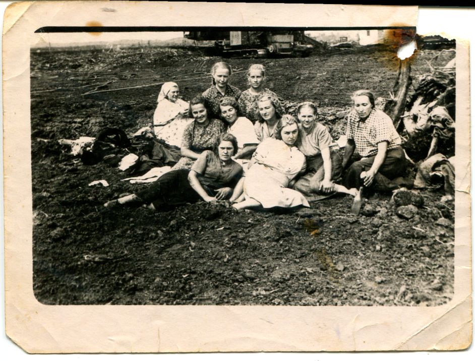 Fotogrāfijā redzama kūdras ieguves brigāde atpūtas brīdī pie savāktiem celmiem. Trešajā rindā 2. no labās - Eleonora Rudoviča.
