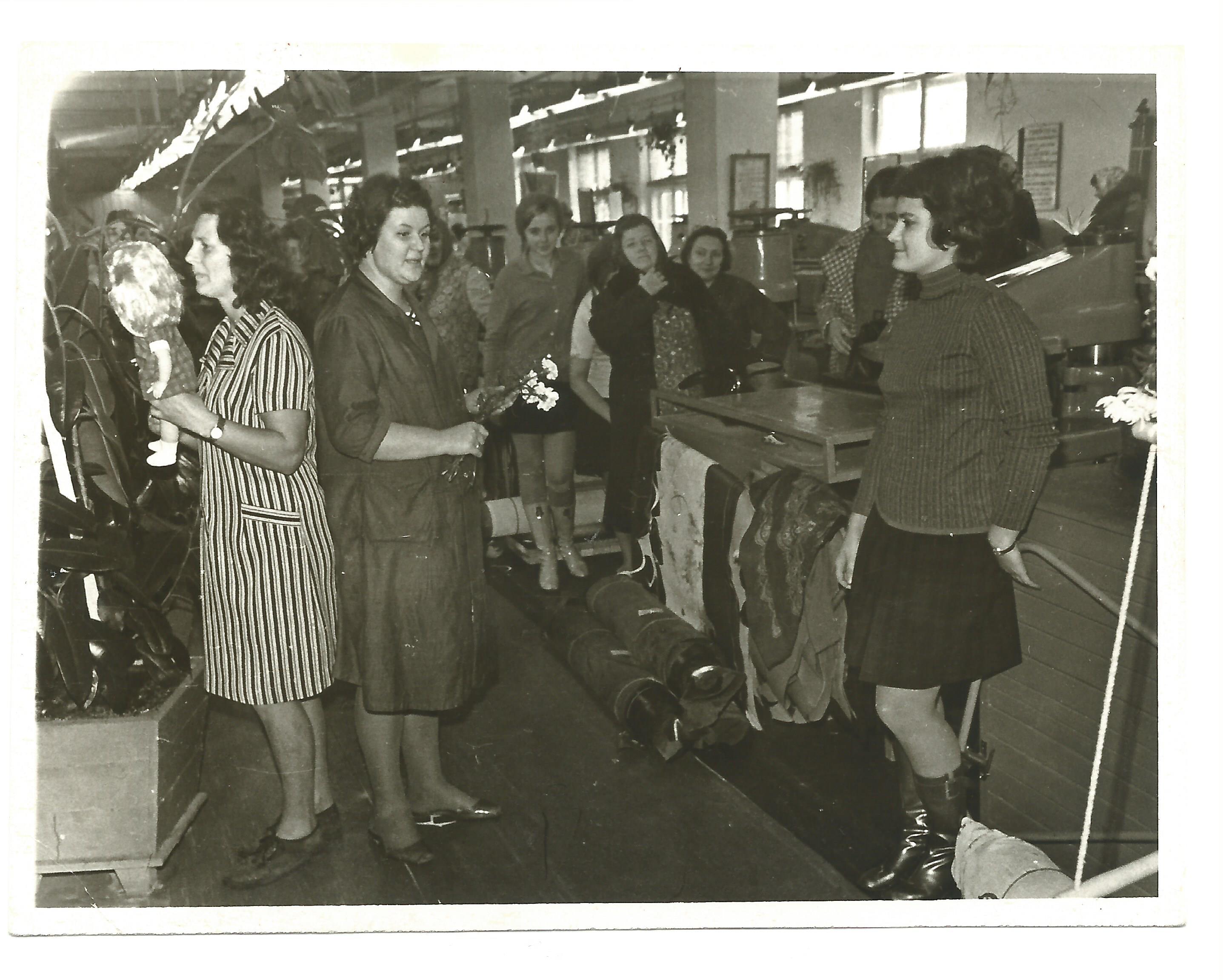 Fotogrāfijā liepājnieces Irinas Pavlovas vecmāmiņa Tatjana Sadomska darba vietā "Liepājas apavi". Darba kolēģi sveic T. Sadomsku 18 gadu dzimšanas dienā, pilngadības svētkos. T. Sadomska uzreiz pēc skolas sāka strādāt uzņēmumā par mācekli-strādnieci, vēlāk par grāmatvedi plānu izpildes nodaļā. Fabrikā "Liepājas apavi" par noliktavas vadītāju strādāja arī Tatjanas Sadomskas mamma.
