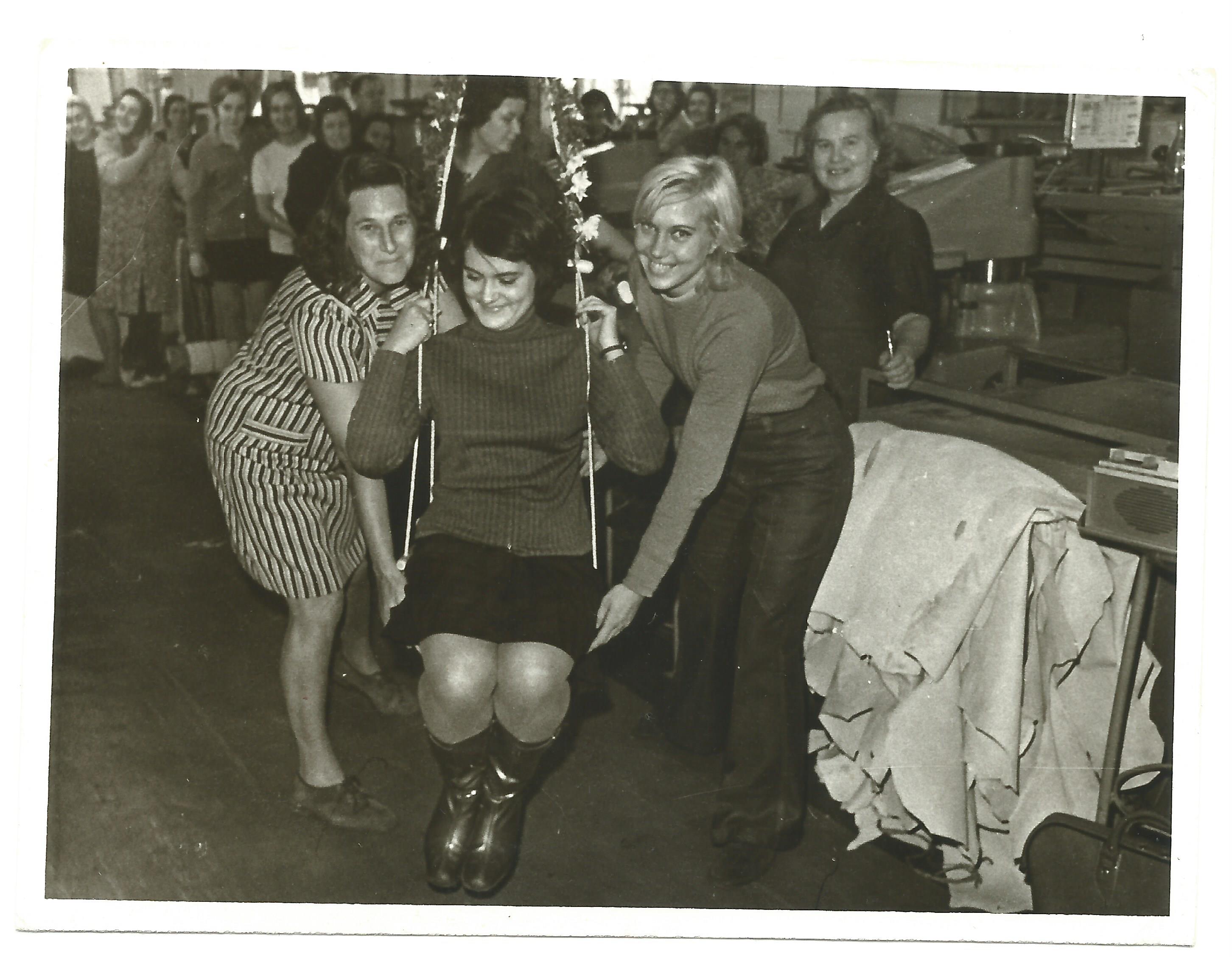 Fotogrāfijā liepājnieces Irinas Pavlovas vecmāmiņa Tatjana Sadomska darba vietā "Liepājas apavos". Darba kolēģi sveic T. Sadomsku 18 gadu dzimšanas dienā, pilngadības svētkos un izšūpina pašdarinātās šūpolēs. T. Sadomska uzreiz pēc skolas sāka strādāt uzņēmumā par mācekli-strādnieci, vēlāk par grāmatvedi plānu izpildes nodaļā. “Liepājas apavos” par noliktavas vadītāju strādāja arī Tatjanas Sadomskas mamma.