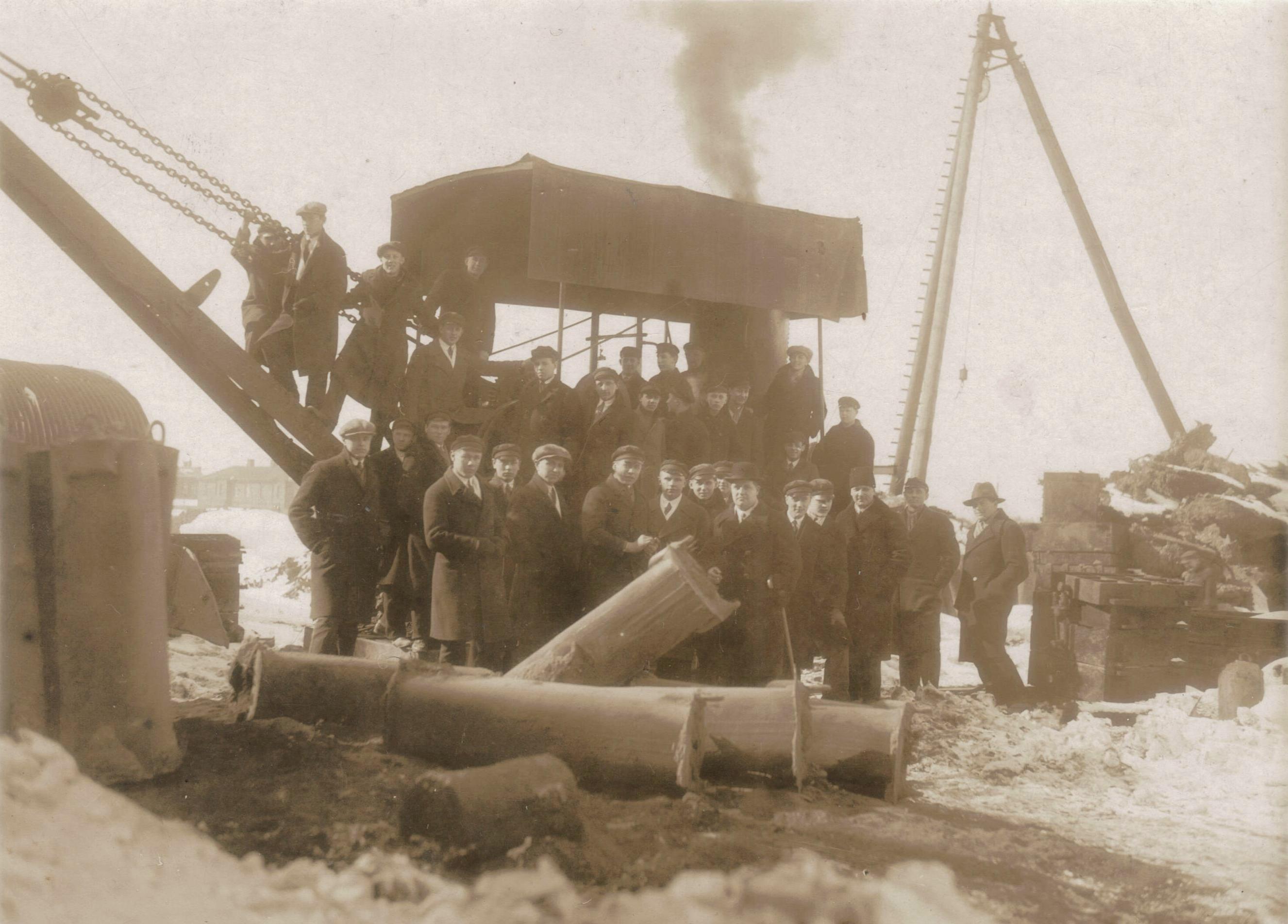 Valsts Liepājas Tehnikuma 3. klase ekskursijā "Beker & Co" (vēlāk Liepājas Metalurgs) fabrikā pie čugunlietuves krāna.