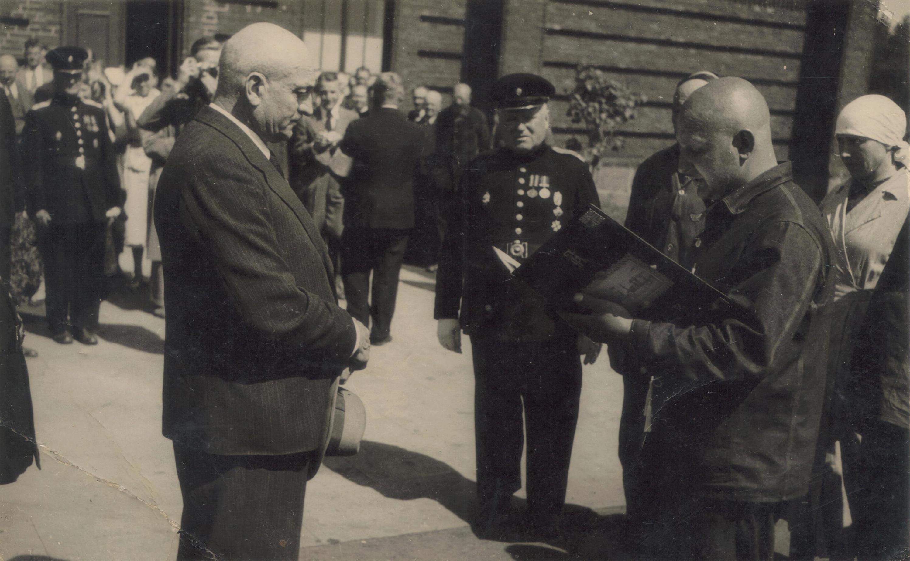 Liepājas K.O.D. direktoru Jāni Ķerpi viņa dienesta 15 gadu jubilejā 1937. gada maijā, apsveic un pasniedz adresi strādnieku pārstāvis V. Stankevičs. Fonā redzami strādnieki, rūpnīcas ugunsdzēsēji un viesi.