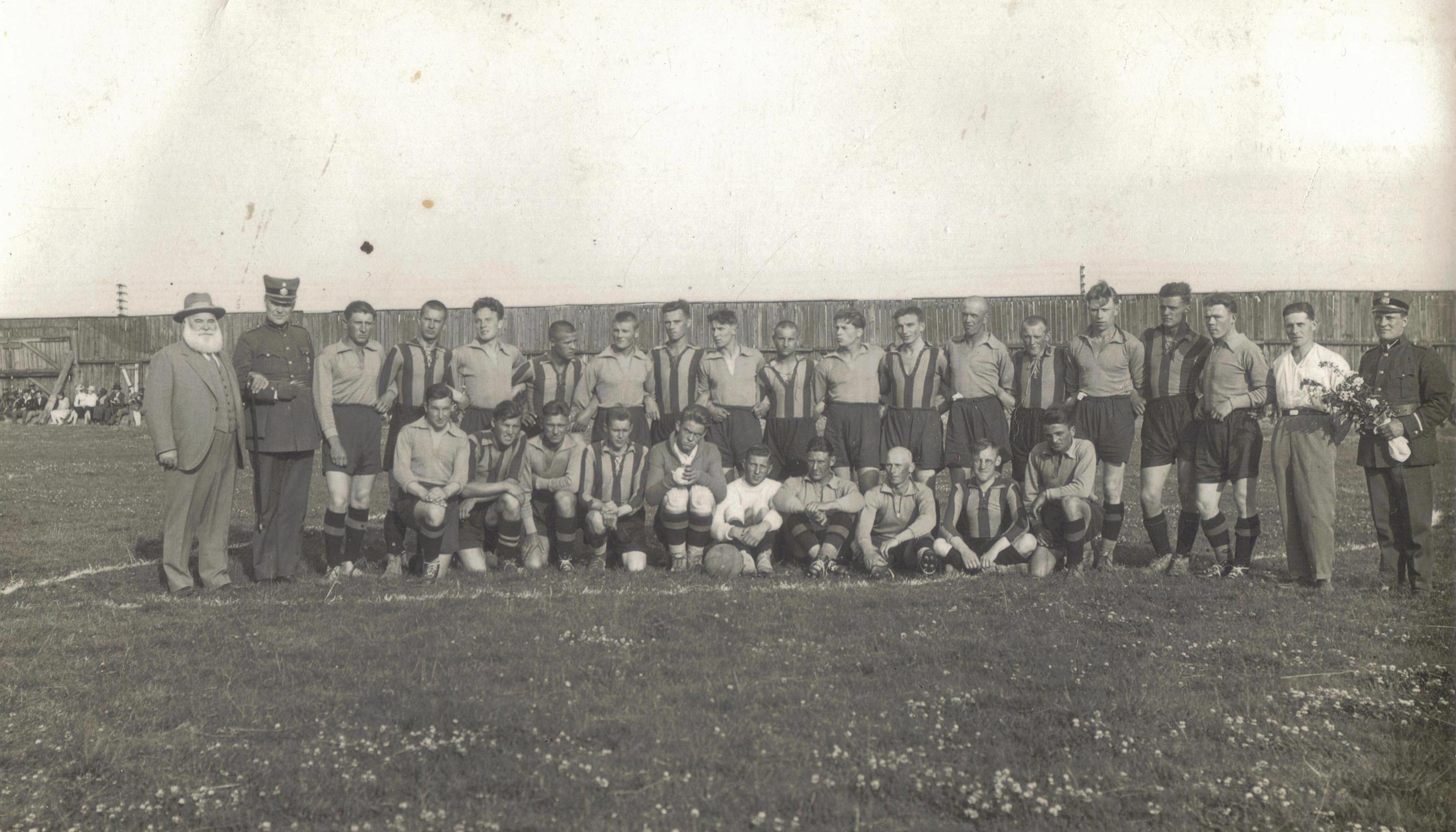 Liepājas drāšu fabrikas sporta laukuma atklāšana 1929. gada 20. jūlijā. Futbola komandas: L.D.F.K. un A.S.K. spēles rezultāts 5:5. Kreisajā malā, sirmais kungs fabrikas direktors Vladimirs Vasiļevičs Markozovs (bijušais cariskās Krievijas virsnieks, 1930. gadu sākumā tiesāts un bankrotējis, 1935. gadā izdarījis pašnāvību). Sporta laukums šobrīd (Zemnieku iela 29.) tiek izmantots un apsaimniekots..