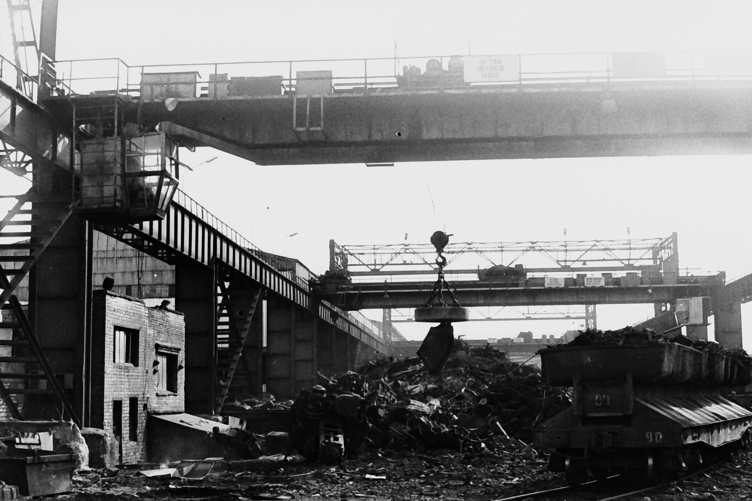 AS "Liepājas Metalurgs" lūžņu sagatavošanas laukums, mazā lūžņu prese un muldas uz vagoniem, kuras paņemot ar speciālu pildceltni, cehā izbēra martena krāsnī. 1990. gadu sākums.