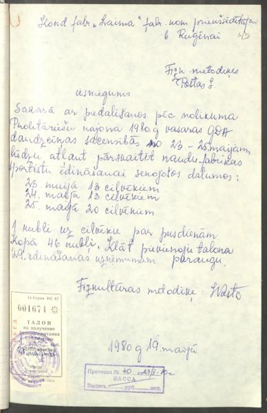 Konditorejas fabrikas “Laima” fizkultūras metodiķes J.Postas iesniegums.