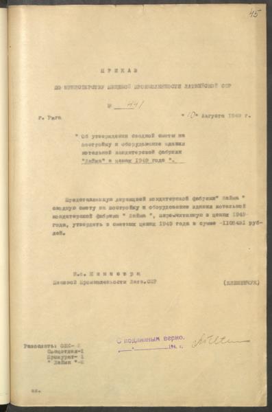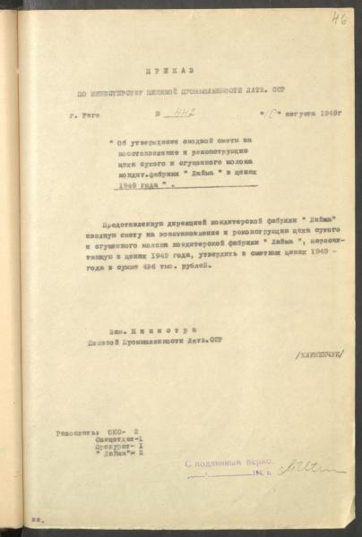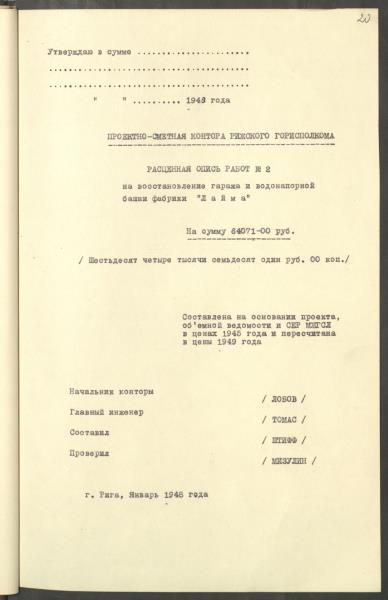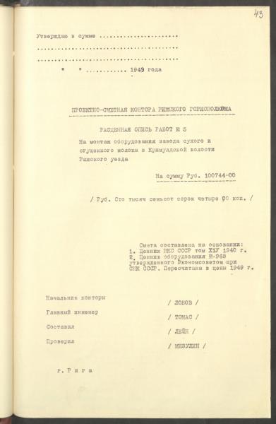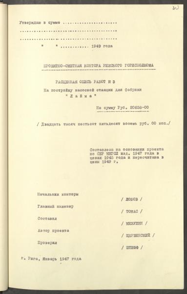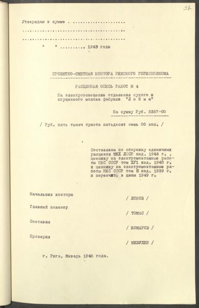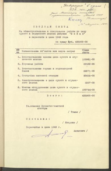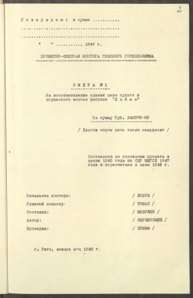 Fonds: Valsts ražošanas un tirdzniecības firma "Laima". Lieta: Tehnisko aprēķinu tāmes iebiezinātā un sausā piena cehu atjaunošanai.