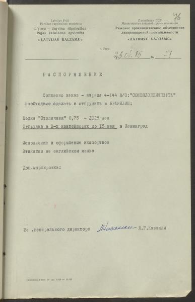 Rīkojums Nr. 71 par produkcijas eksportu uz Brazīliju.