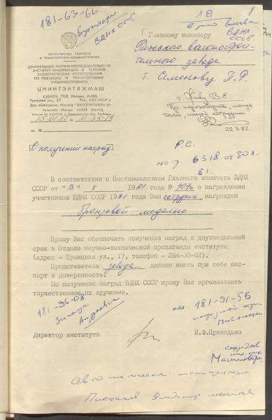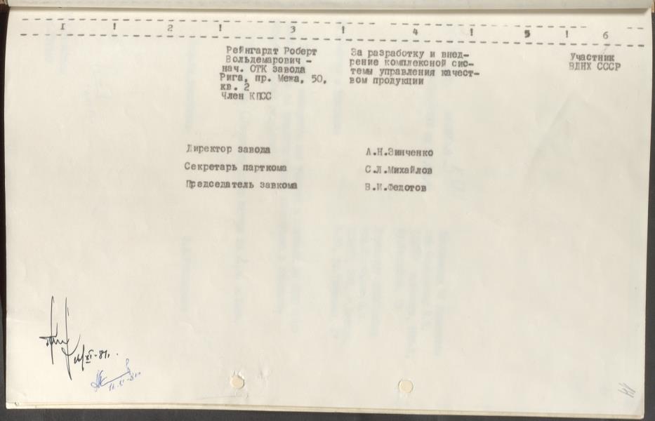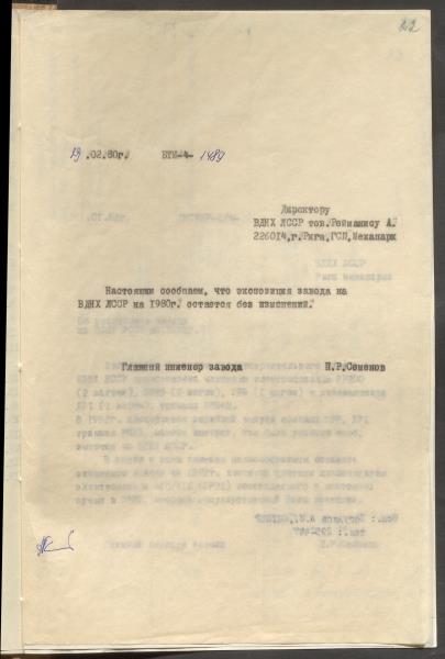 Dokumenti par rūpnīcas dalību PSRS Tautas sasniegumu izstādē 1980.-1982.g.