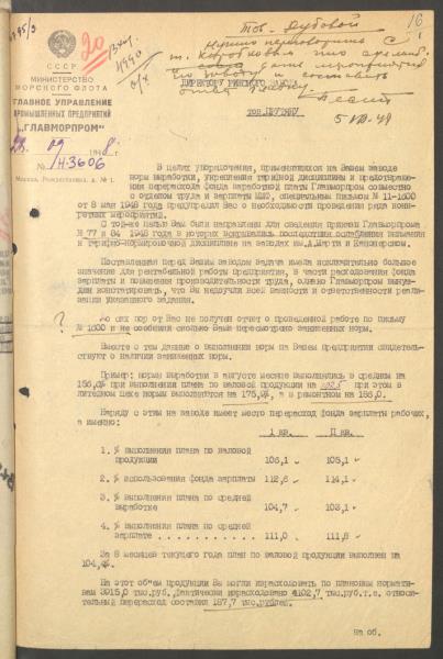 Sarakste ar PSRS Jūras flotes ministriju par darba samaksas organizāciju rūpnīcā 1948.g.