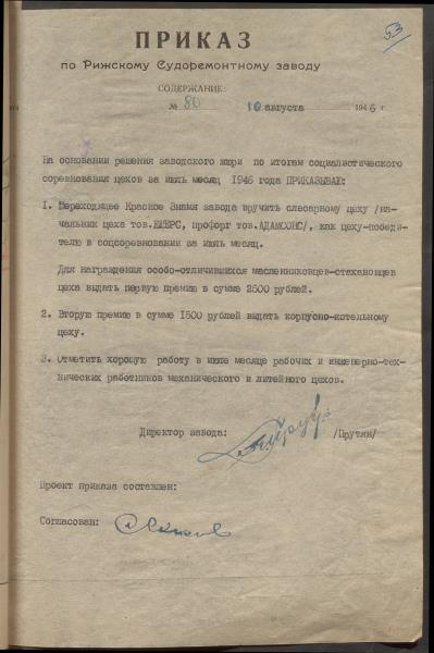 Fonds: "Rīgas kuģu remonta rūpnīca", valsts uzņēmums. Lieta: Pavēles par rūpnīcas pamatdarbību 1946.g.