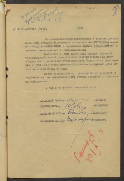 Fonds: "Rīgas kuģu remonta rūpnīca", valsts uzņēmums. Lieta: Akti par celtniecības objektu pieņemšanu ekspluatācijā 1945.-1951.g.