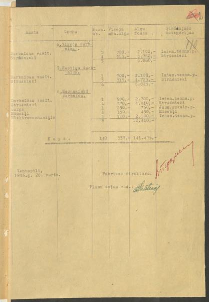 Fonds: Ventspils zivju konservu kombināts. Lieta: Štatu projekts, administratīvi – saimniecisko izdevumu tāmes, reģistrācijas kartiņa 1946.gadā