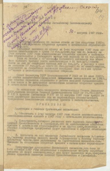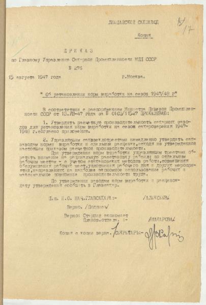 Fonds: Liepājas cukurfabrika, valsts akciju sabiedrība. Lieta: Latvijas cukurbiešu tresta protokols un pavēles par fabrikas darbvedību