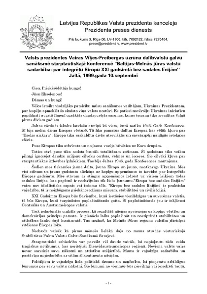 Valsts prezidentes Vairas Vīķes-Freibergas uzruna dalībvalstu galvu sanāksmē starptautiskajā konferencē ''Baltijas-Melnās jūras valstu sadarbība: par integrētu Eiropu XXI gadsimtā bez sadales līnijām'' Jaltā, 1999.gada 10.septembrī