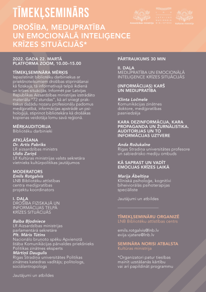 2022. gada 22. martā tiešsaistes platformā Zoom Latvijas Nacionālā bibliotēka (LNB) aicināja bibliotēku darbiniekus uz tīmekļsemināru "Drošība, medijpratība un emocionālā inteliģence krīzes situācijās". Tā mērķis bija iepazīstināt ar priekšnoteikumiem drošības stiprināšanai kā fiziskajā, tā informatīvajā telpā ikdienā un krīzes situācijās. Vienlaikus klātesošie tika informēti par Aizsardzības ministrijas izstrādāto materiālu "72 stundas", kā arī saņēma praktiskus dažādu nozaru profesionāļu padomus medijpratībā, informācijas apstrādē un psiholoģijā, stiprinot bibliotekāra kā drošākas kopienas veidotāja lomu savā reģionā.
