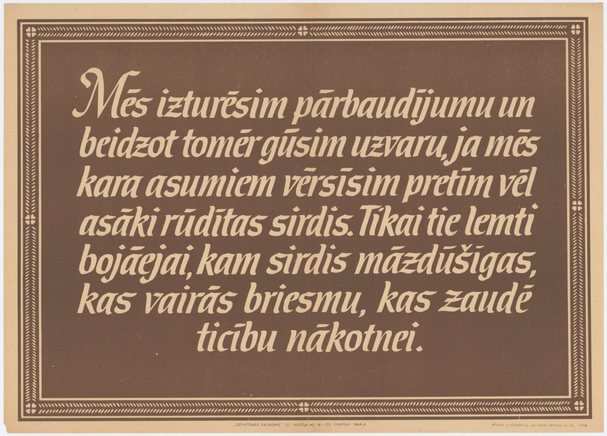 Mēs izturēsim pārbaudījumu un beidzot tomēr gūsim uzvaru, ja mēs kara asumiem vērsīsim pretīm vēl asāk rūdītas sirdis. Tikai tie lemti bojāejai, kam sirdis mā[a]zdūšīgas, kas vairās briesmu, kas zaudē ticību nākotnei [attēls] / mākslinieks nezināms