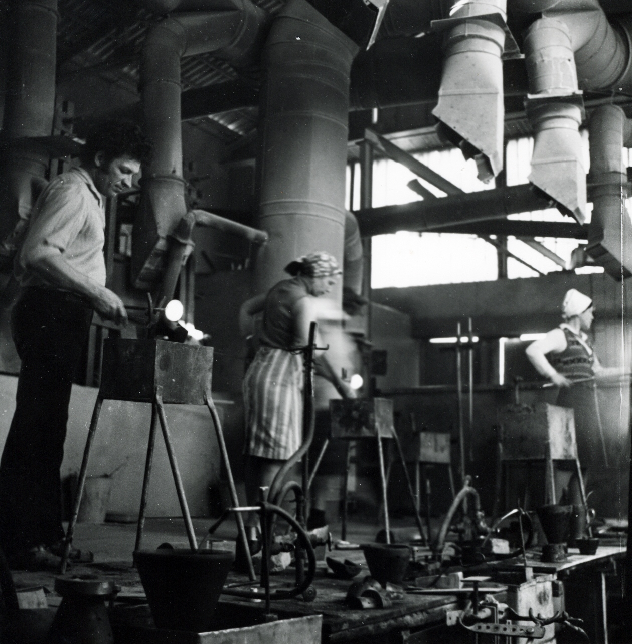 Stikla pūtēji darba procesā Līvānu stikla fabrikā 20.gs. 80.gadi