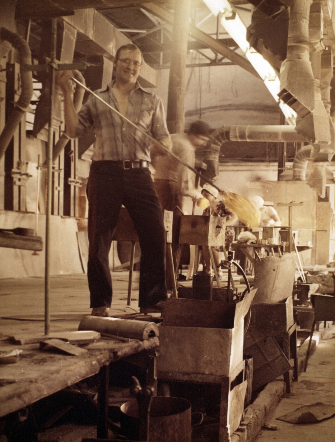 Stikla pūtēji darba procesā Līvānu stikla fabrikā 20.gs. 80.gadi.Priekšplānā stikla pūtējs Jānis Lapiņš