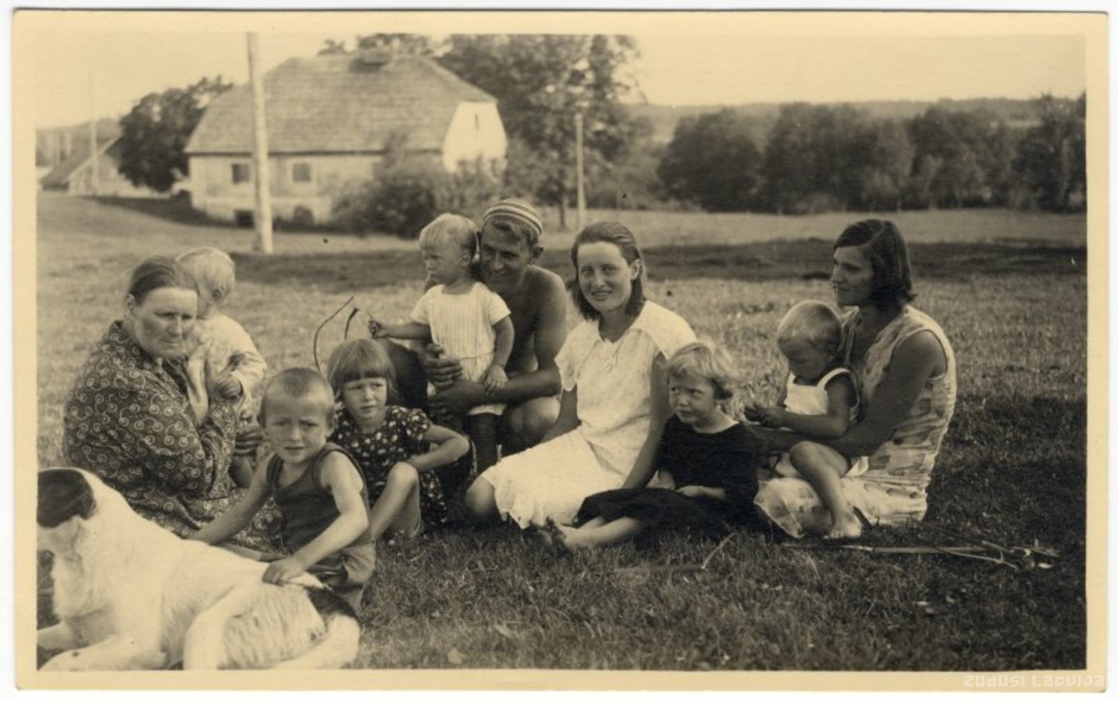 Karva. Ģimene ar bērniem un suni pļavā pie brūža