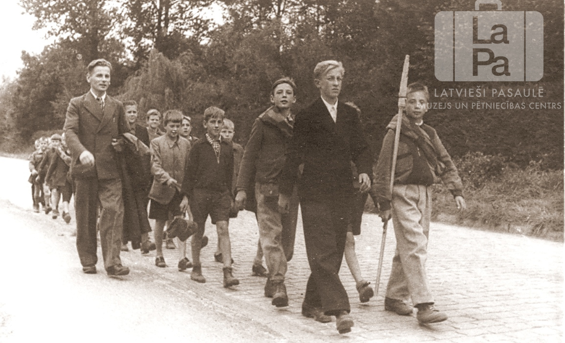 Skautu grupa no Bernsenes nometnes (angļu zonā) dodas ciemos uz Saules nometni Gēsthahtā.