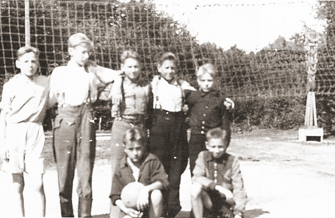 Septiņi zēni pie tīkla volejbola laukumā Bernsenes nometnē (angļu zonā). Priekšā, no kreisās: Imants Lilenfelds, Andris Adamovičs. Aizmugurē, no kreisās: Modris Novickis, Leonīds Oldermanis, Gunārs Vjaters, Gunārs Pudists, Jānis Kaminskis.