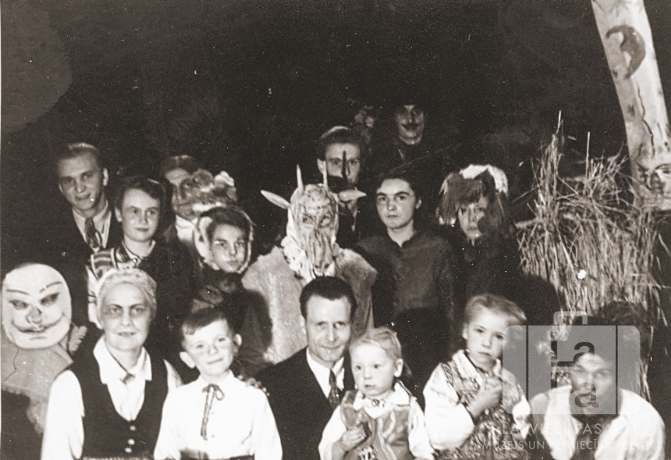 Bērni un pieaugušie maskās un tērpos Mārtiņdienas atzīmēšanā "Geesthachter Hof” telpās Špakenbergas nometnē Gēsthahtā (angļu zonā).
