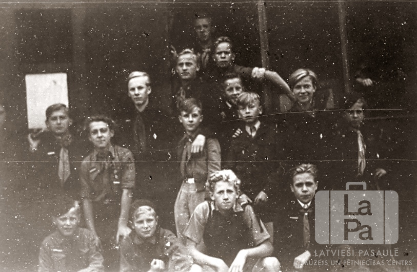 Šalkones 35. skautu vienības skauti no Špakenbergas nometnes Gēsthahtā (angļu zonā) ceļā uz skautu nometni, kas notika Timmendorfā 1948. gada 17.–31. augustā.