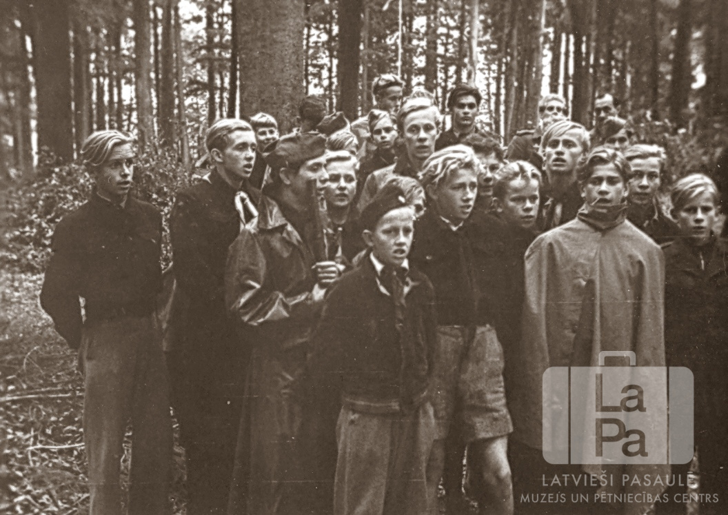 Šalkones 35. skautu vienības skauti no Špakenbergas nometnes Gēsthahtā (angļu zonā) piedalās dziedāšanas sacensībās skautu nometnē Timmendorfā 1948. gada 17.–31. augustā.